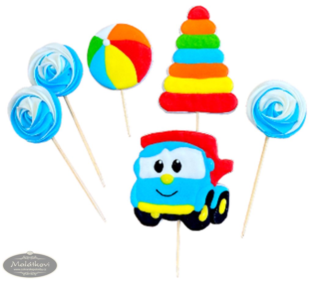 Jedlá cukrová dekorace na dort v motivu autíčka s lízátky. Ideální pro rychlé a čisté dozdobení narozeninového dortu.