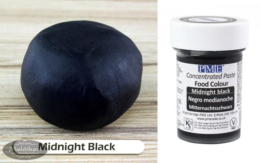 Pro dokonale černou barvu finálního produktu doporučujeme použít jako základ tmavou potahovací hmotu (např. čokoládovou), čímž bude třeba k dokonalému probarvení jen menší množství černého barviva, případně si pomoci kakaem.