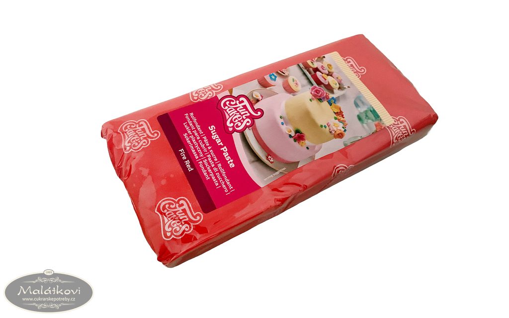 Fondán Fire Red má krásnou jasně červenou barvu a lahodnou vanilkovou chuť. Skvěle se hodí na potahování dortů a vykrajování tvarů. Před použitím těsto dobře prohněťte a rozválejte na tenkou vrstvu moučkového cukru. Cukrovou pastu můžete také použít k modelování nebo vytváření různých tvarů a vzorů. Hodí se také k přibarvení potravinářskými barvami.