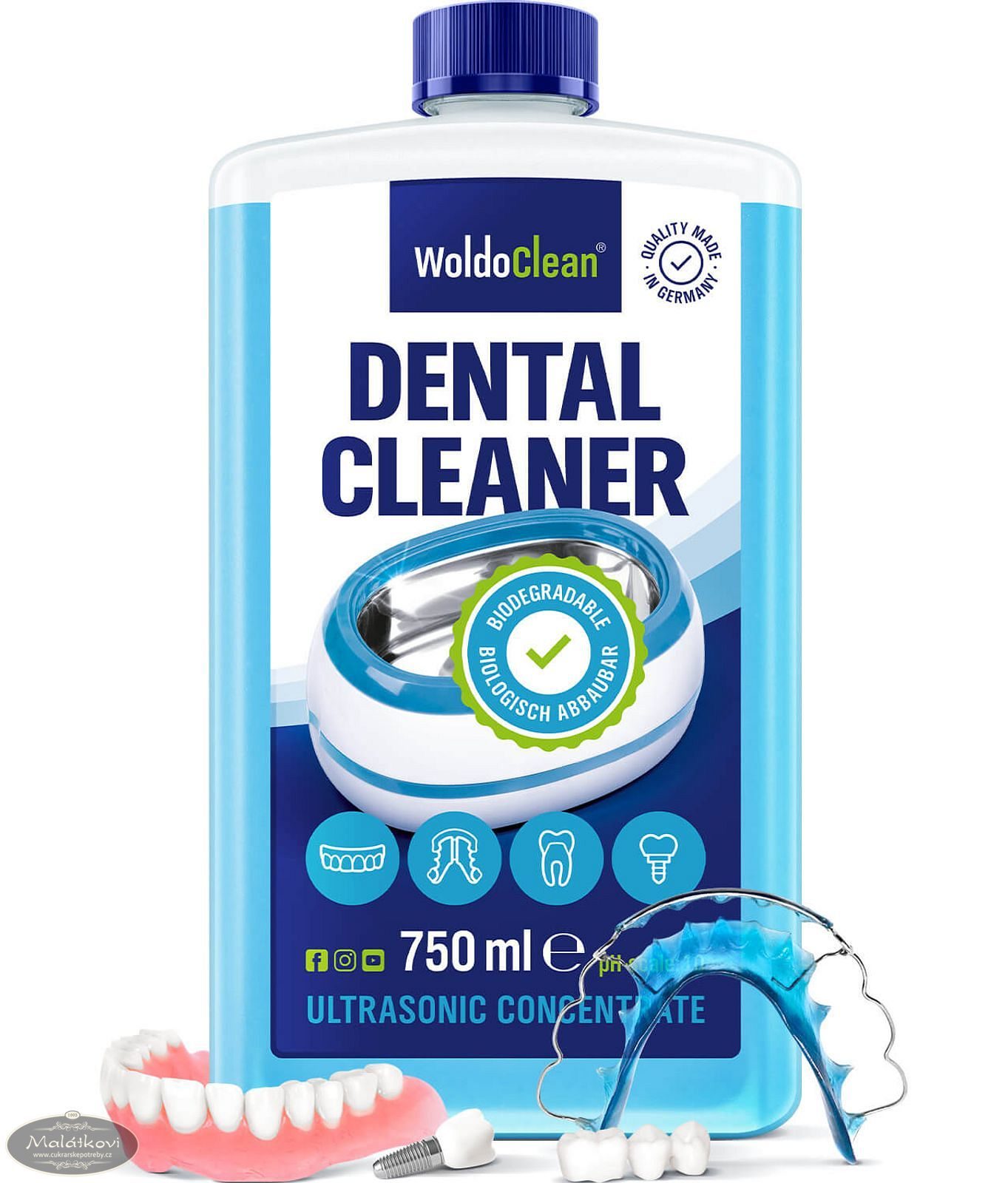 Odstraňuje zabarvení, usazeniny a je bez zápachu a chuťově neutrální. Díky vibracím a vlnám ultrazvukového přístroje se odstranit částečky nečistot na zubní protéze. Odstraňuje plak a zabarvení na zubních protézách. Bez chlóru, nevybledne zubní plast. Po ultrazvukovém čištění důkladně opláchněte vodou, abyste odstranili zbytky nečistot. Pro všechny typy zubních protéz, zubních náhrad, rovnátek, nástavců na zubní kartáčky.