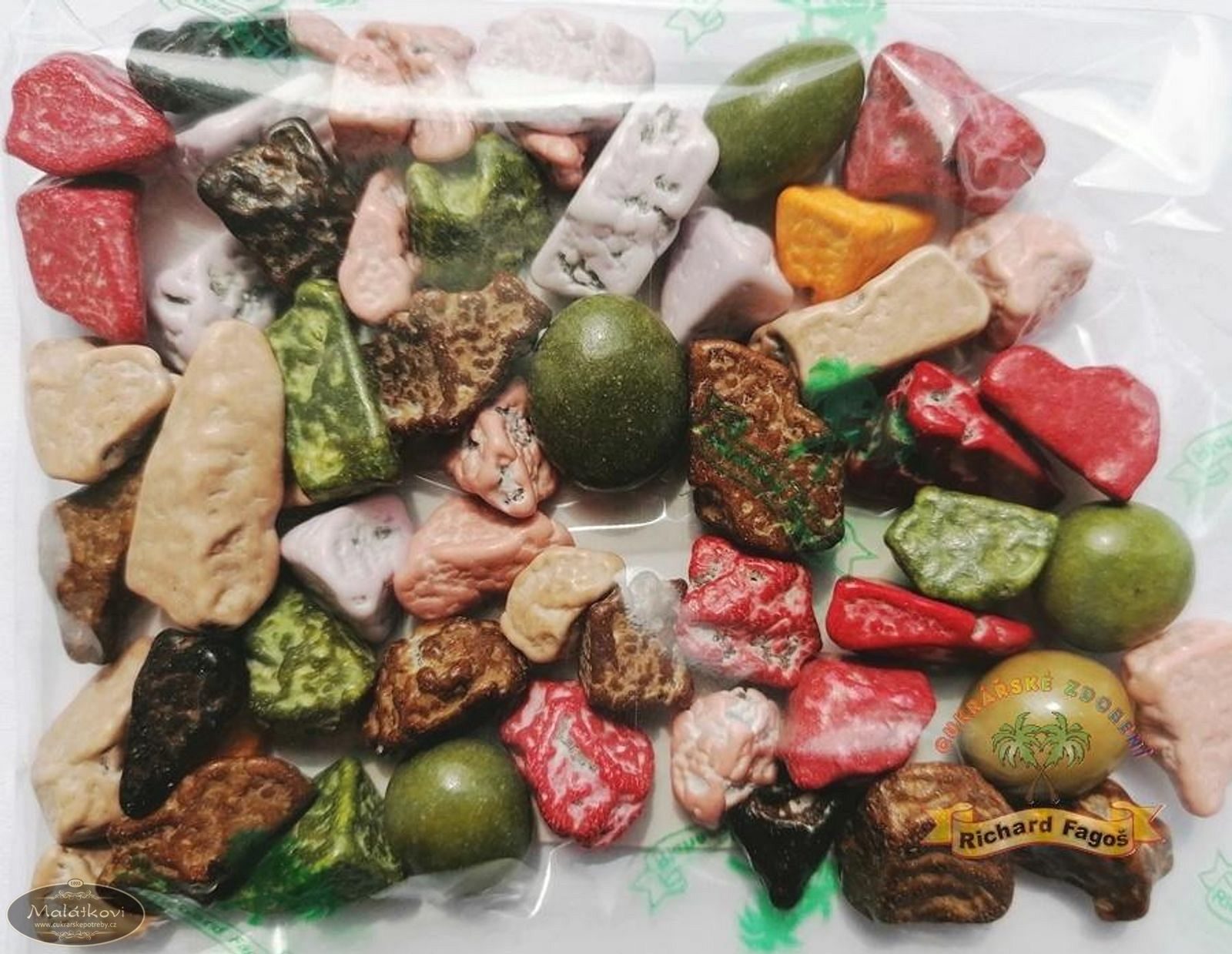 Čokoládové barevné kamínky určené ke zdobení dortů, zákusků atd.. Složení: náplň min.70%(cukr, palmový tuk, kakao.prášek, laktóza, sušené pln.mléko(alergen), sojový lecitin E322(alergen), aroma), cukr, vepř.želatina, leštící prostředky E903, barviva E171,E120,E140,E150d,E160c,E163. Výživové údaje (100g): Energetická hodnota 2115KJ/506kcal Tuky 25g z toho nasyc.mast.kys. 15g Sacharidy 62,5g z toho cukry 54,8g Bílkoviny 5,1g Vlaknina 5,4g Sůl 2,2g