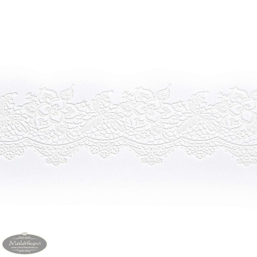 Jedlá cukrová krajka v bílé barvě pro elegantní dozdobení dortu. Hodí se pro vytváření jemných krajkových lemů a dekorů.