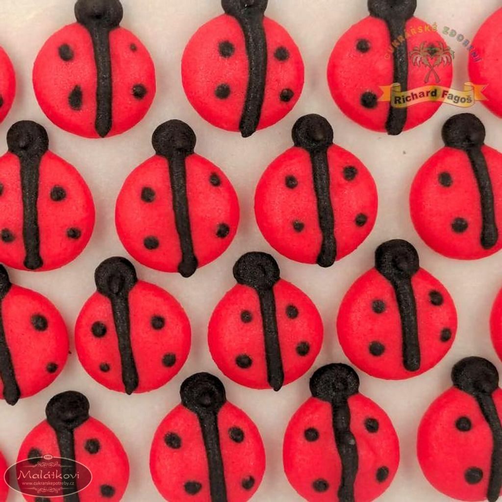 Cukrová dekorace určená ke zdobení cukrářských dezertů, dortů a zmrzlin. Berušky o velikosti cca 1,5 cm. 24 kusů na platíčku. Cena za 1 balení 24 kusů.