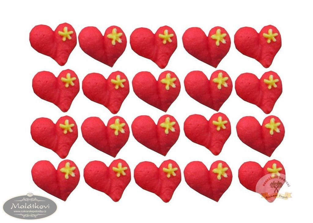 Cukrová dekorace určená ke zdobení cukrářských dezertů, dortů a zmrzlin. Srdíčka s kytičkou o velikosti cca 1,5 cm. Platíčko obsahuje 20 kusů.