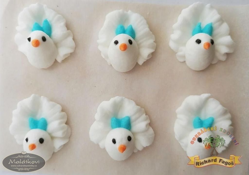 Foto je pouze ilustrační. Jedná se o RUČNÍ VÝROBU, proto se výrobky od sebe mohou mírně lišit. Velikost holubičky 2cm.Minimální trvanlivost: dle data na obalu (1 rok od data výroby)Chraňte před slunečním zářenímSložení: cukr, amylin, vaječný bílek(alergen), barviva E102*,E110*,E122*,E124*,E129,E151. *Tato barviva mohou nepříznivě ovlivňovat činnost a pozornost dětí. Výživové údaje (100g): Energetická hodnota 1556KJ/366kcal Tuky 0g z toho nas.mastné kys. 0g Vláknina 0g Sacharidy 90g z toho cukry 88,5g Bílkoviny 1,5g Sůl 0g