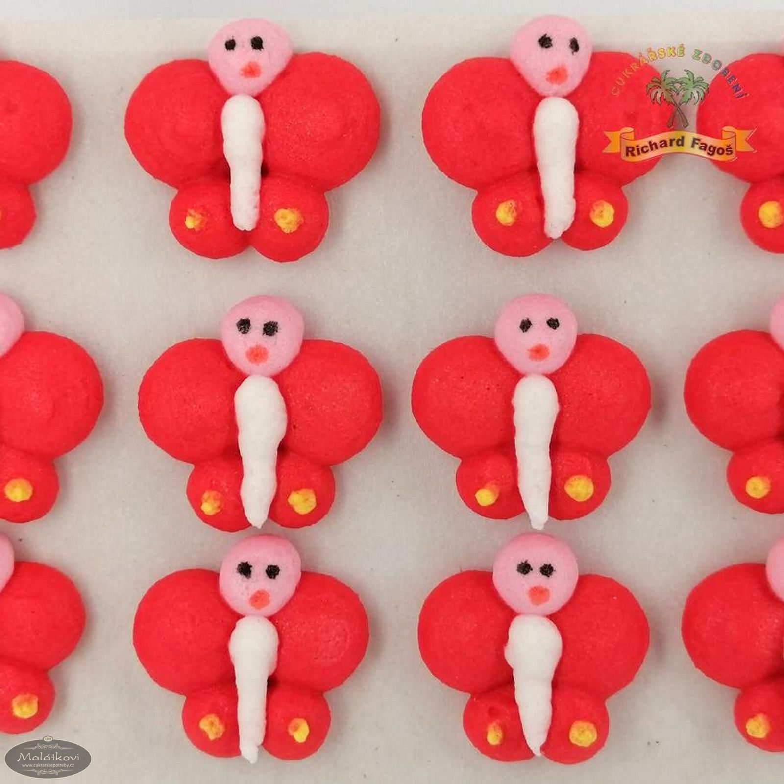 Cukrová dekorace určená ke zdobení cukrářských dezertů, dortů a zmrzlin.Motýl o velikosti cca 1,5 cm. 12 kusů na platíčku. Cena za 1 balení 12 kusů.