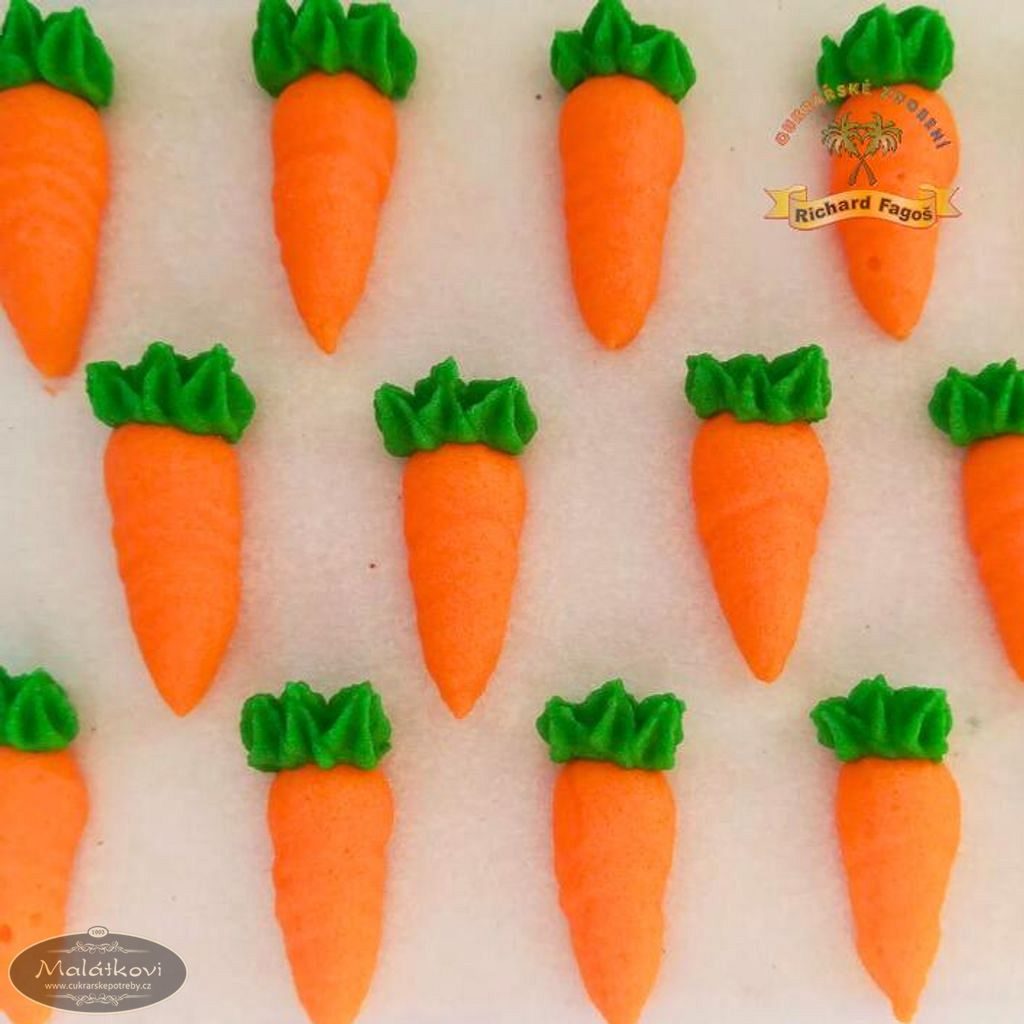 Cukrová dekorace určená ke zdobení cukrářských dezertů. Vhodné především ke zdobení mrkových dortů. Mrkvičky o velikosti cca 2,5cm. Cena za 1 platíčko (15 kusů).