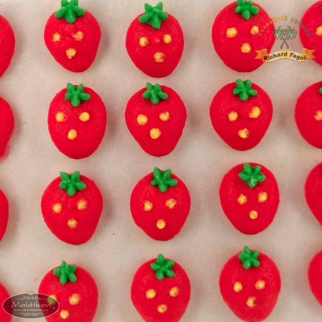Cukrová dekorace určená ke zdobení cukrářských dezertů. Jahůdky o velikosti cca 1,3cm. Cena za 1 platíčko (24 kusů).