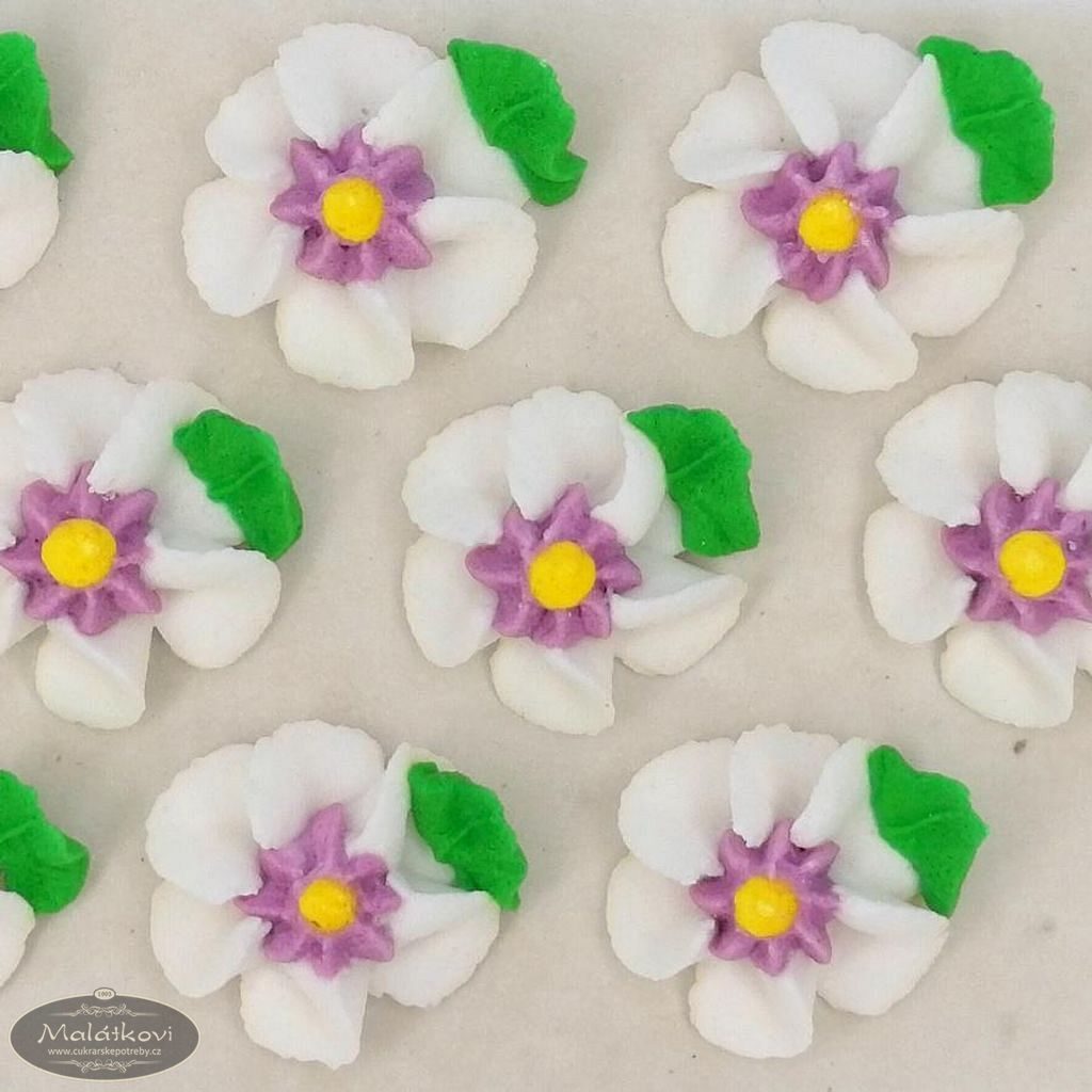 Cukrová dekorace určená ke zdobení cukrářských dezertů, dortů a zmrzlin. 9 květů v balení. Velikost i s lístečkem cca 2,5cm.
