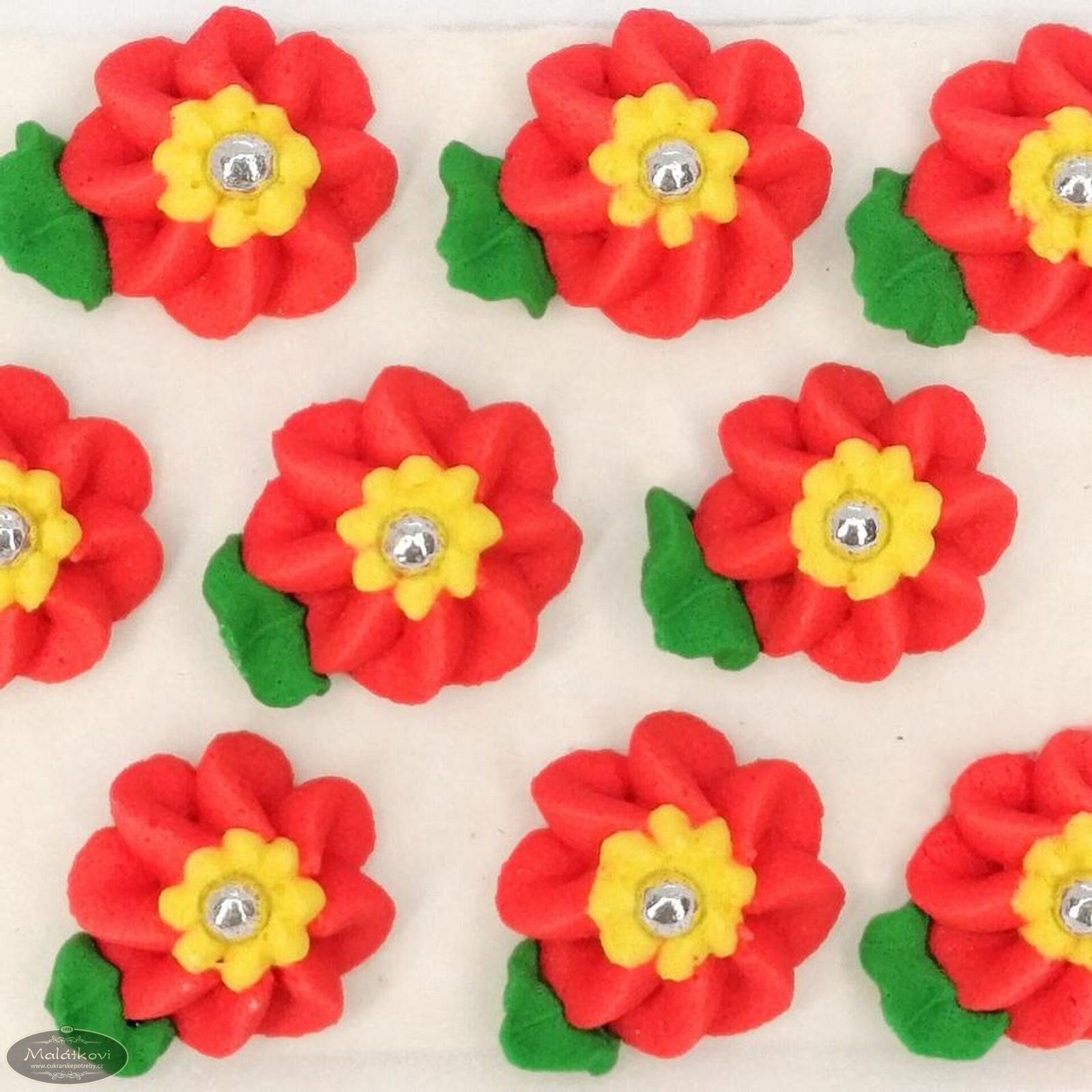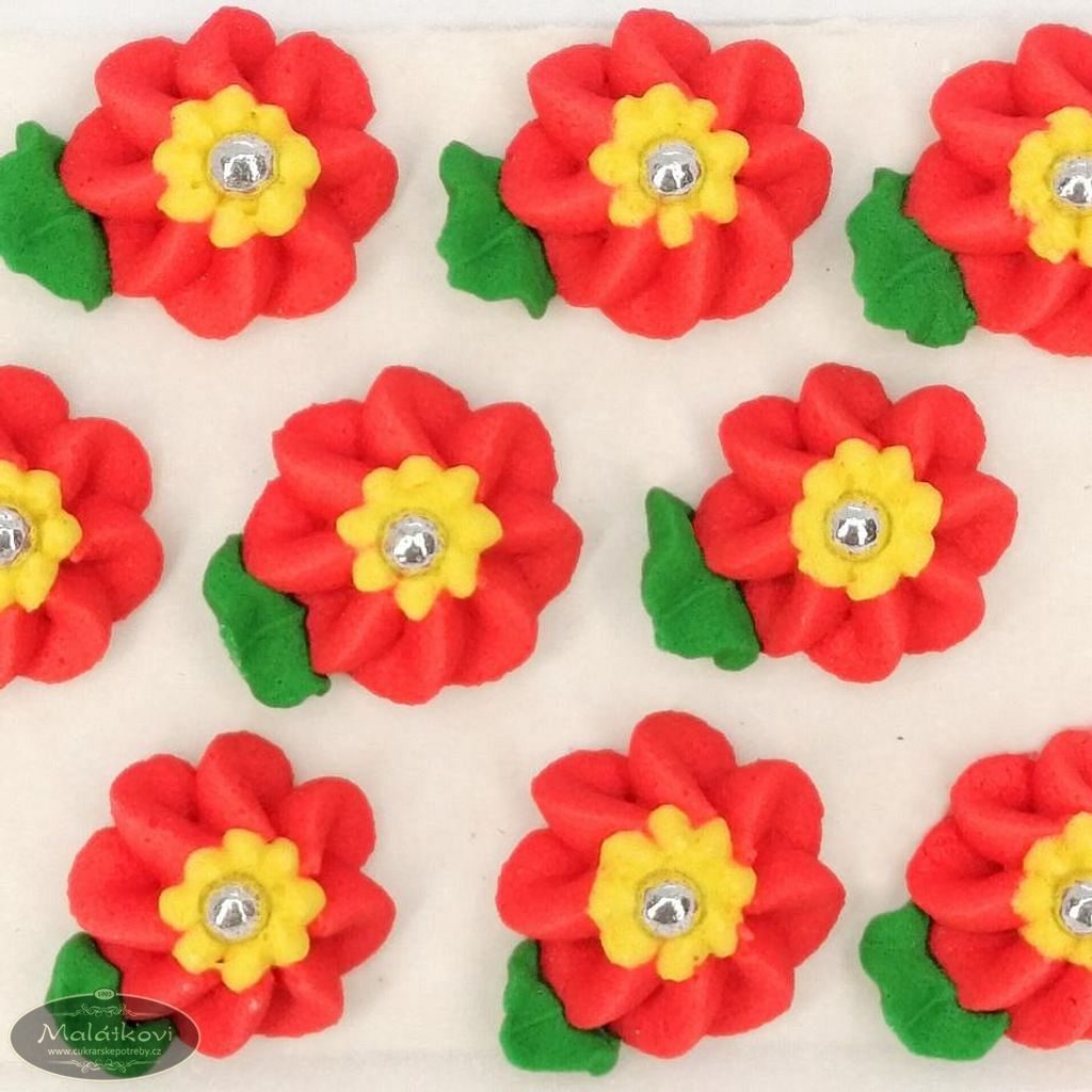 Cukrová dekorace určená ke zdobení cukrářských dezertů, dortů a zmrzlin. 9 květů v balení. Velikost i s lístečkem cca 2,5cm.