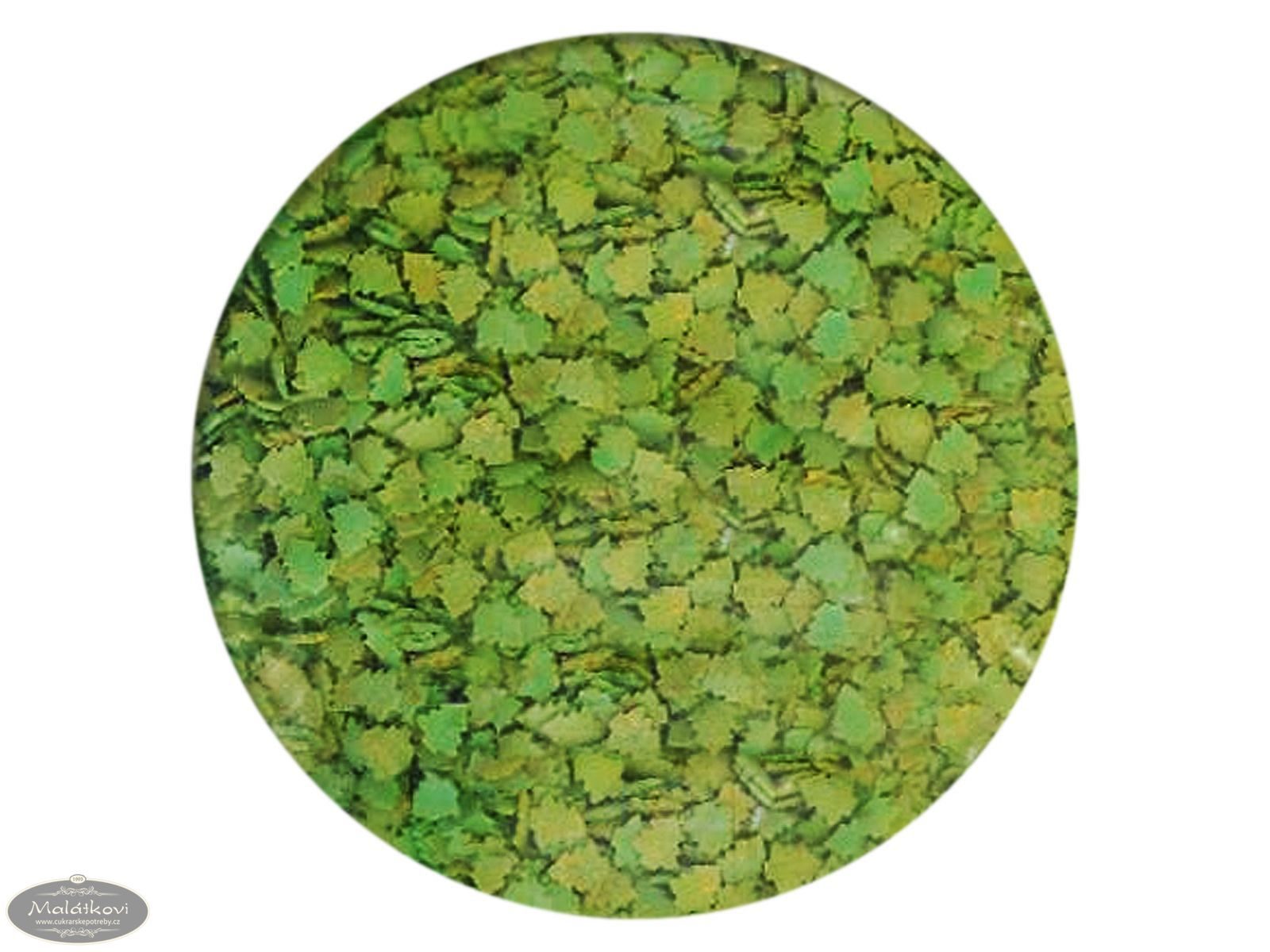 Cukrové zdobení v podobě zelených stromečků se zlatým leskem - baleno á 50 g, výška 10 mm.