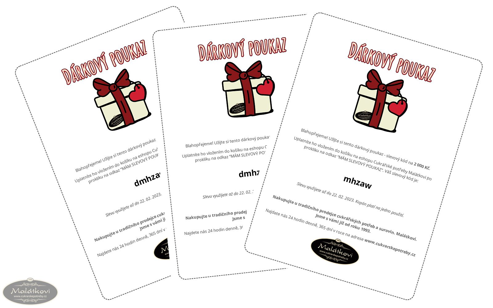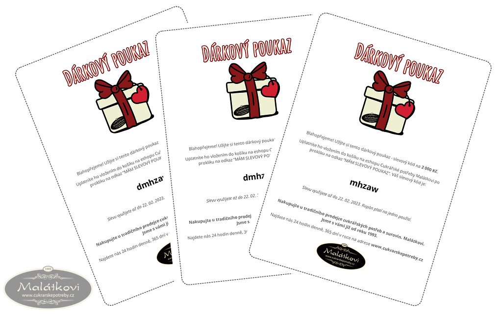 Dárkový poukaz je v hodnotě 500 Kč vč. DPH pro odběr jakéhokoli zboží dle vlastního výběru z našeho eshopu. Po úhradě od nás obdržíte kód, který vložíte vy nebo vámi obdarovaný v košíku do pole, k tomu určenému, a z ceny objednávky mu bude tato částka automaticky odečtena.