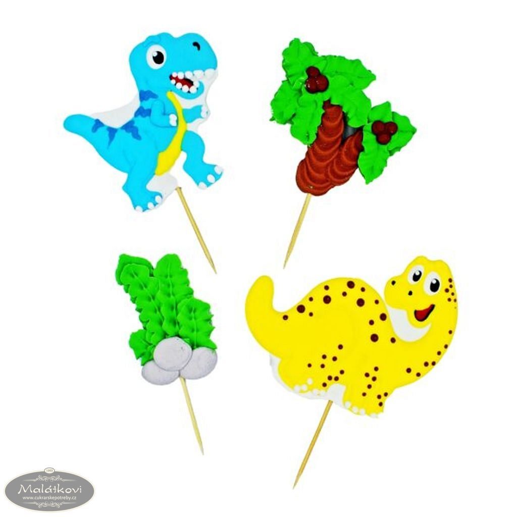 Cukrová dekorace na dort s motivem dinosaurů. Zápichy jsou dvojrozměrné (2D) a pomohou rychle a jednoduše dozdobit váš dort.