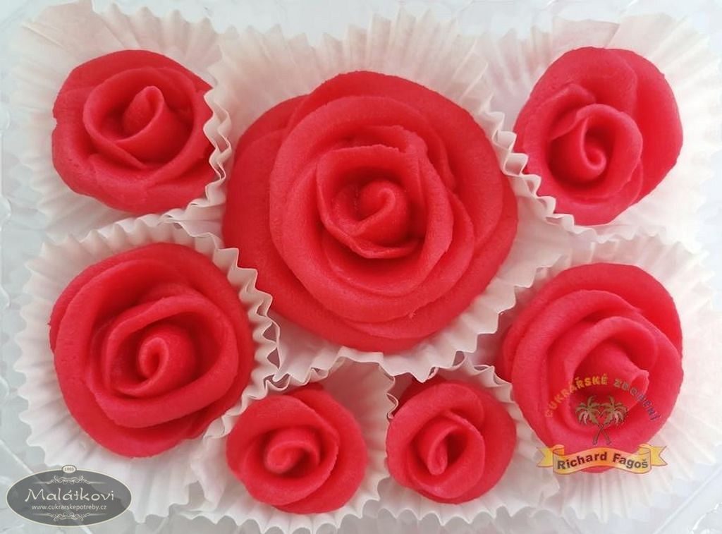Ručně vyrobené růže červené barvy z kokosové modelovací hmoty s příchutí aroma sladkých mandlí. Směs růží od největší rozkvetlé růže až po poupátko.Sada je speciálně vytvořena pro květinovou výzdobu dortů. Cena za krabičku. Balení neobsahuje lístky k růžím. Složení: cukr, glukóz.sirup, suš.mléko(alergen), kokos, voda, mandlové aroma, konzer.E202, barvivo E124*. *Toto barvivo může nepříznivě ovlivňovat činnost a pozornost dětí. Výživové údaje (100g): Energetická hodnota 1790KJ/424kcal Tuky 8,8g z toho nas.mastné kys. 8,3g Sacharidy 83,5g z toho cukry 77,5g Vláknina 2,2g Bílkoviny 1,6g Sůl 0,2g