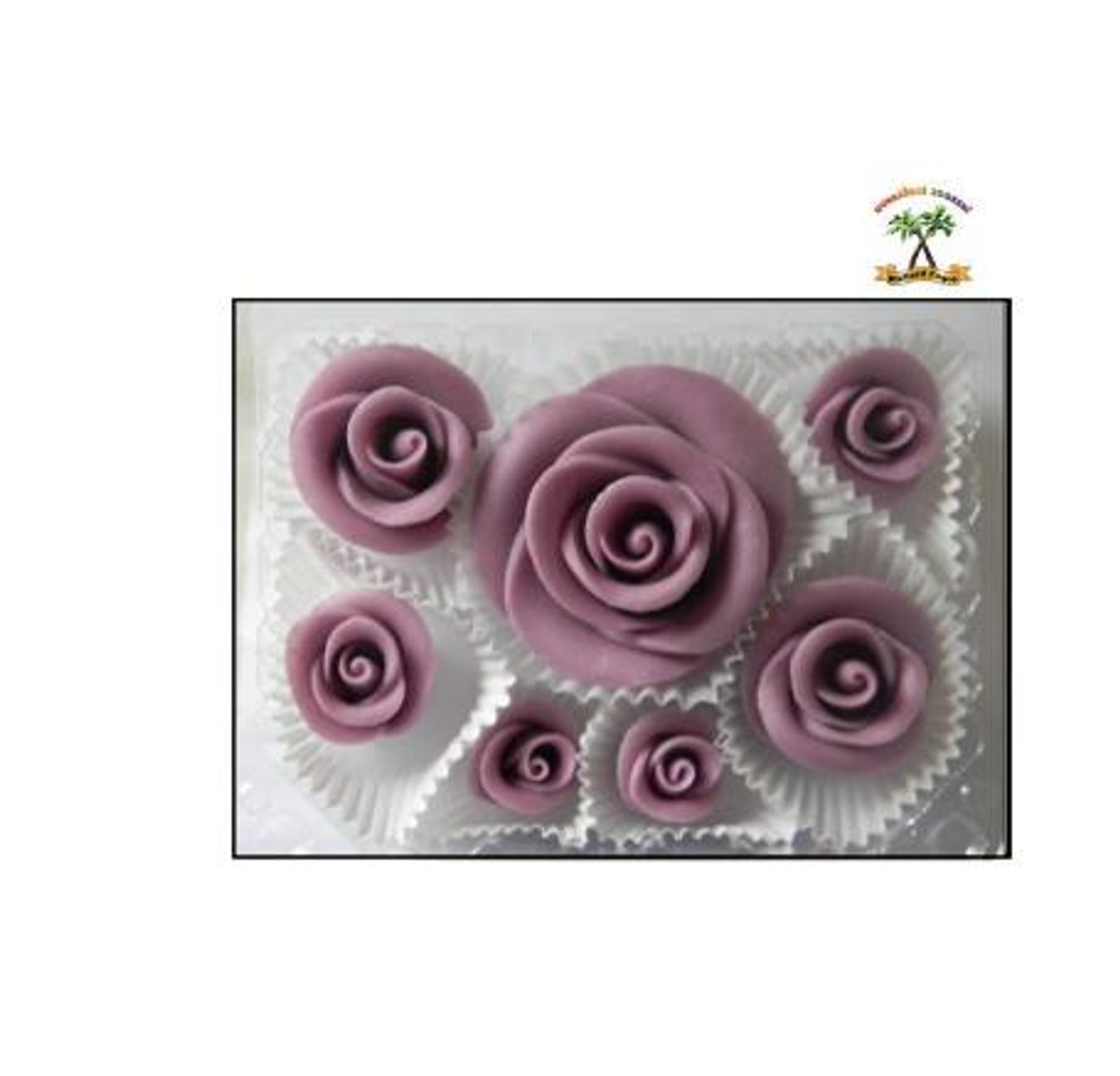 Ručně vyrobené růže fialové barvy z kokosové modelovací hmoty s příchutí aroma sladkých mandlí. Směs růží od největší rozkvetlé růže až po poupátko.Sada je speciálně vytvořena pro květinovou výzdobu dortů. Cena za krabičku.Balení neobsahuje lístky k růžím. Složení: cukr, glukóz.sirup, suš.mléko(alergen), kokos, voda, mandlové aroma, konzer.E202, barvivo E124*,E133. *Toto barvivo může nepříznivě ovlivňovat činnost a pozornost dětí. Výživové údaje (100g): Energetická hodnota 1790KJ/424kcal Tuky 8,8g z toho nas.mastné kys. 8,3g Sacharidy 83,5g z toho cukry 77,5g Vláknina 2,2g Bílkoviny 1,6g Sůl 0,2g