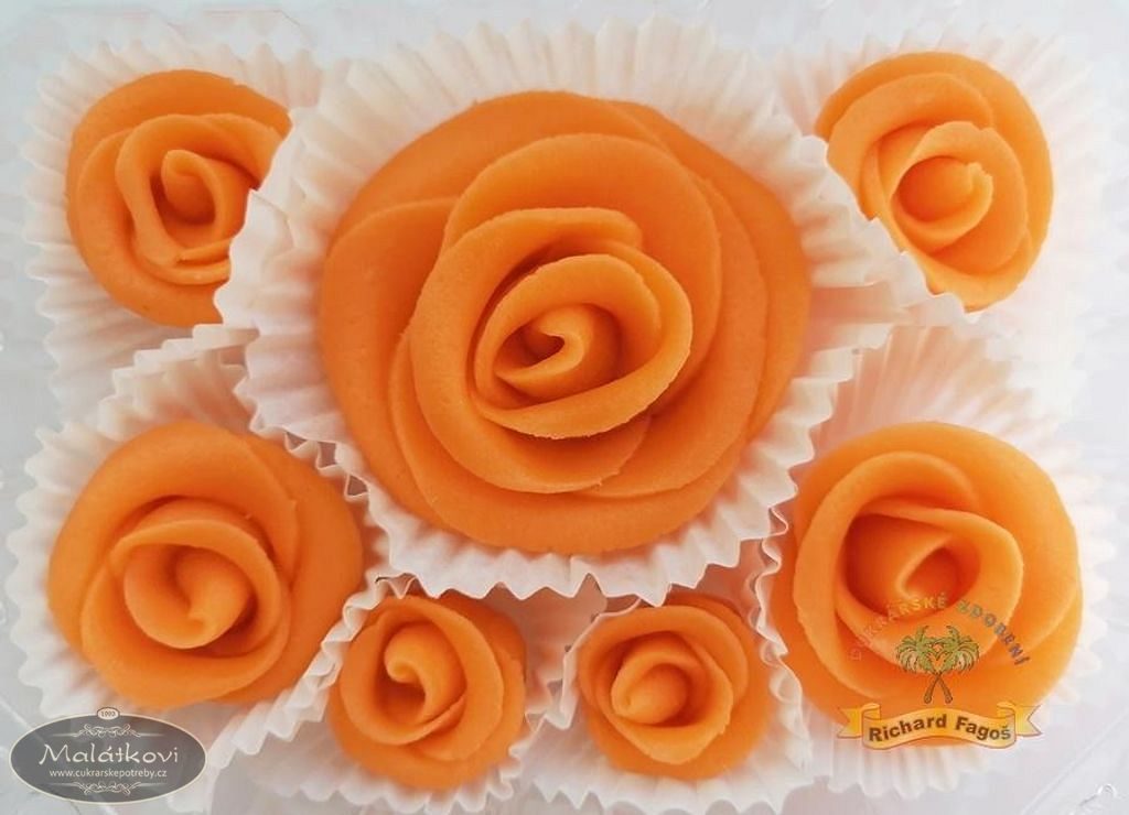 Ručně vyrobené růže červené barvy z kokosové modelovací hmoty s příchutí aroma sladkých mandlí. Směs růží od největší rozkvetlé růže až po poupátko.Sada je speciálně vytvořena pro květinovou výzdobu dortů. Cena za krabičku. Balení neobsahuje lístky k růžím. Složení: cukr, glukóz.sirup, suš.mléko(alergen), kokos, voda, mandlové aroma, konzer.E202, barvivo E110*. *Toto barvivo může nepříznivě ovlivňovat činnost a pozornost dětí. Výživové údaje (100g): Energetická hodnota 1790KJ/424kcal Tuky 8,8g z toho nas.mastné kys. 8,3g Sacharidy 83,5g z toho cukry 77,5g Vláknina 2,2g Bílkoviny 1,6g Sůl 0,2g