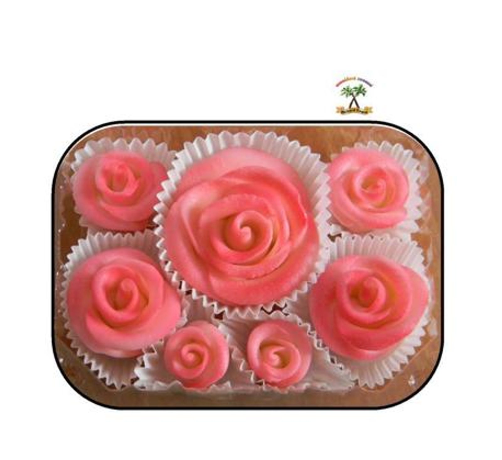 Ručně vyrobené růže jemně stříknuté růžovou potravinářskou barvou z kokosové modelovací hmoty s příchutí aroma sladkých mandlí. Směs růží od největší rozkvetlé růže až po poupátko.Sada je speciálně vytvořena pro květinovou výzdobu dortů. Cena za krabičku. Balení neobsahuje lístky k růžím. Složení: cukr, glukóz.sirup, suš.mléko(alergen), kokos, voda, mandlové aroma, konzer.E202, barviva E124*,E122*. *Tato barviva mohou nepříznivě ovlivňovat činnost a pozornost dětí. Výživové údaje (100g): Energetická hodnota 1790KJ/424kcal Tuky 8,8g z toho nas.mastné kys. 8,3g Sacharidy 83,5g z toho cukry 77,5g Vláknina 2,2g Bílkoviny 1,6g Sůl 0,2g