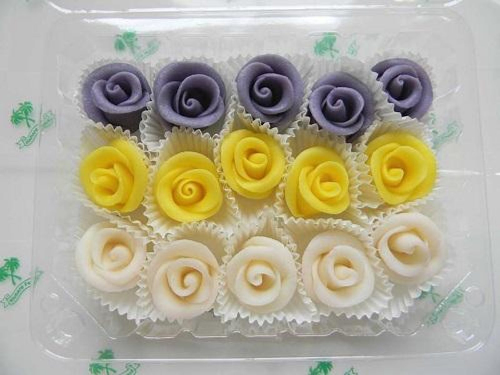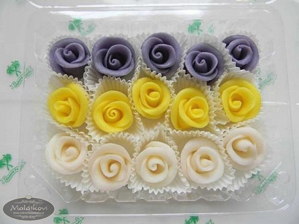 Ručně vyrobené růže z kokosové modelovací hmoty s příchutí aroma sladkých mandlí. Velikost růže je cca šířka 2,3cm, výška 2cm. Květ se skládá ze čtyř okvětních lístků. Hmotnost: cca 6g. Použití na dorty, zákusky, svatební dorty atd. Cena za krabičku (15ks).