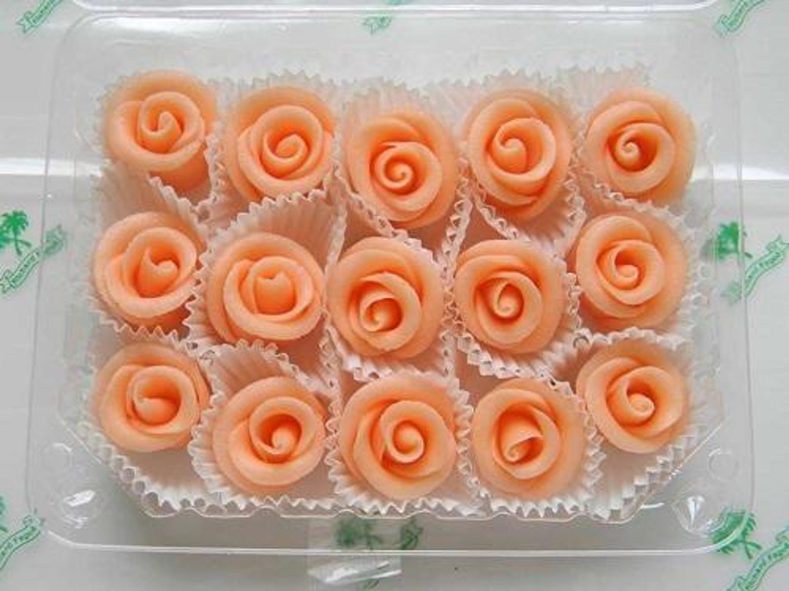 Ručně vyrobené růže z kokosové modelovací hmoty s příchutí aroma sladkých mandlí. Velikost růže je cca šířka 2,3cm, výška 2cm. Květ se skládá ze čtyř okvětních lístků. Hmotnost: cca 6g. Použití na dorty, zákusky, svatební dorty atd. Cena za krabičku (15ks).