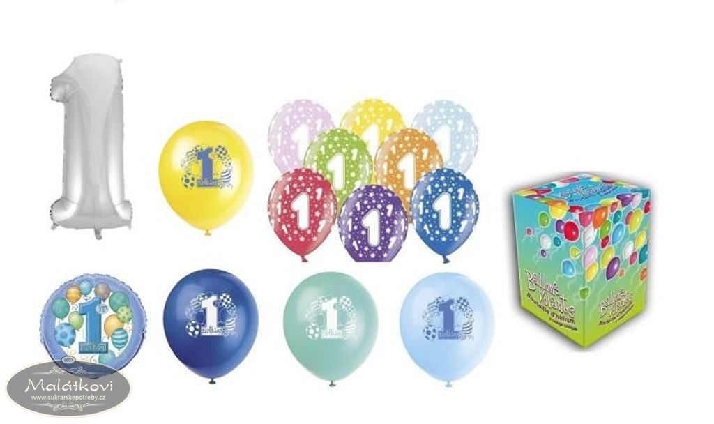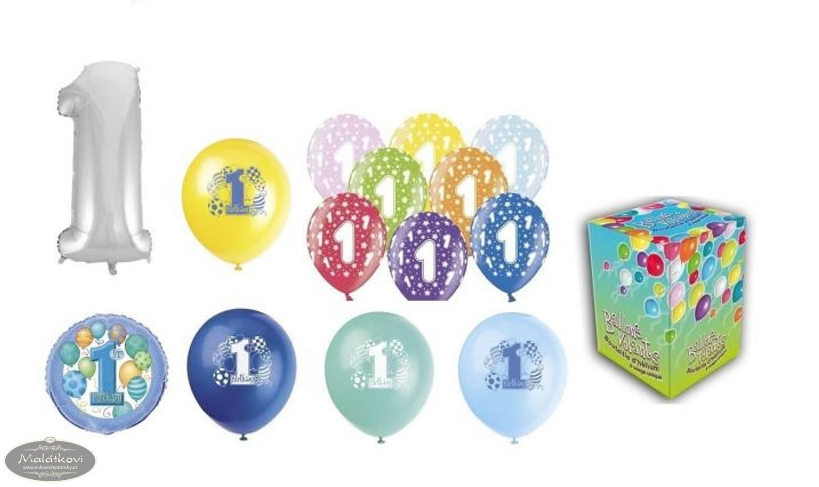 - 2 ks foliových balonků (1 ks stříbrná číslice „1“ s průměrem 115 cm, 1 ks balonek s potiskem „1“)