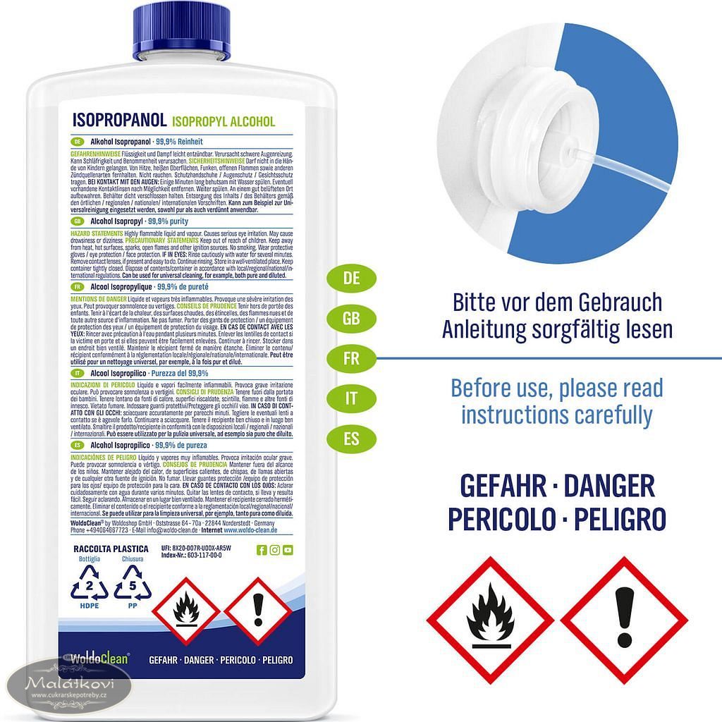 - WoldoClean isopropanol je ideální pro řadu aplikací v domácnosti, lékařství, průmyslu nebo dílnách.