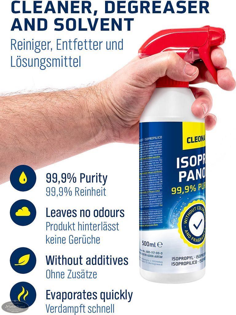 - Isopropanol se skládá z 99,9% alkoholu a neobsahuje žádné přísady barev a vonných látek. Proto je náš Cleona isopropanol bezbarvý a má typický mírně sladký, ostrý zápach.