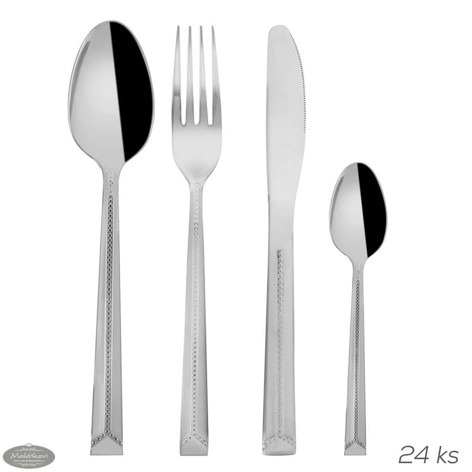 Příbor jídelní - 24 ks s povrchem z lesklého nerezu. Rozměry - d.: lžíce - 19,5 cm, vidlička - 19,5 cm, nůž - 22 cm,…