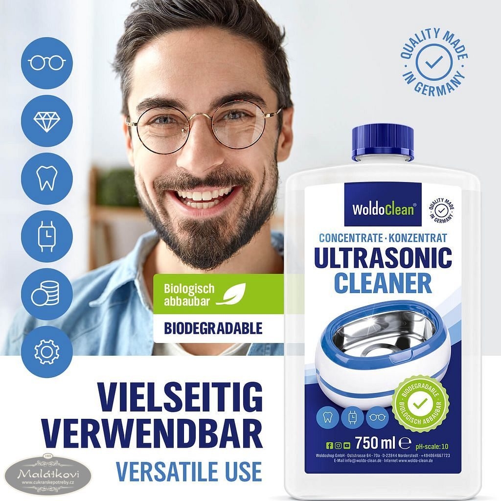 K všestrannému použití jako koncentrát, nebo ředitelný až 1:40*. Kompatibilní ve všemi ultrazvukovými čističkami. Biologicky rozložitelný. Použití: Smíchejte koncentrát s vodou* a naplňte čističku. Vložte čištěný předmět*. Vyčištěný předmět poté opláchněte čistou vodou.