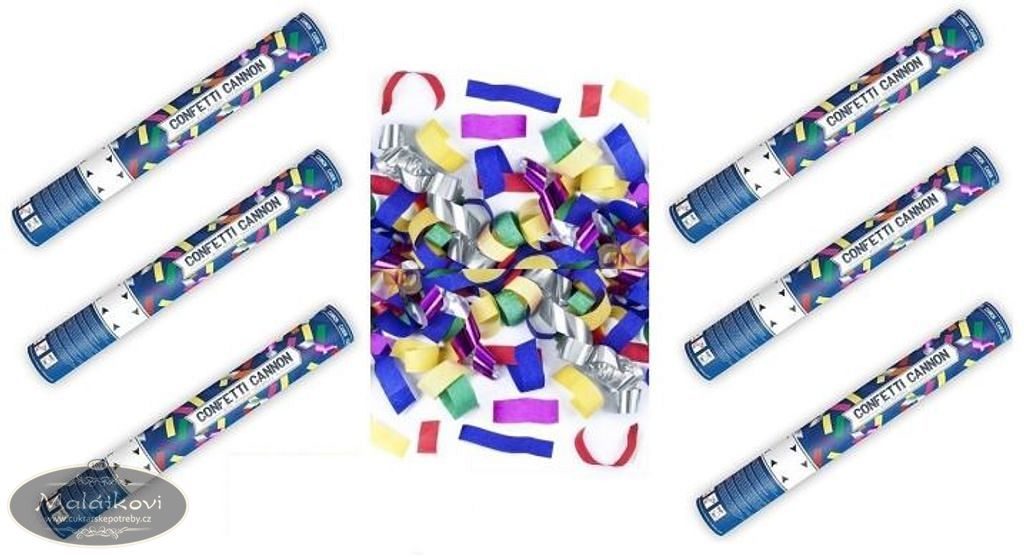 Konfety jsou uloženy ve válcovité kovové tubě, která se drží v ruce a ovládá mechanickým pootočením. Po vystřelení se barevné proužky rozptýlí do okolí, a to díky iniciaci stlačeným vzduchem. Maximální délka odpálení až 8 metrů zaručuje působivé efekty.