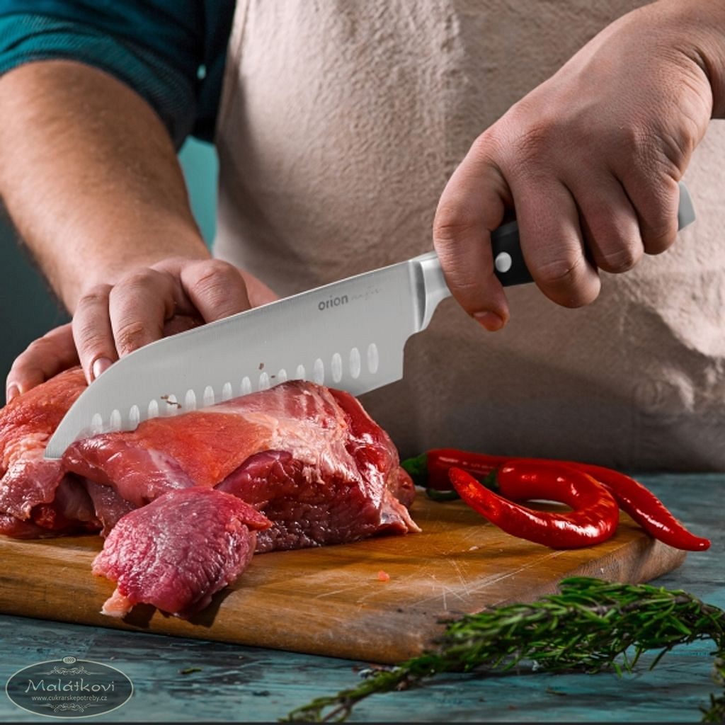 Kuchyňský nůž z kolekce Master je ideální volbou nejen pro profesionální kuchaře, ale také pro vášnivé amatérské kulináře, domácí gurmány a labužníky. Nůž je dlouhý 33 cm, čepel má délku 18,5 cm a ostří 17,5 cm. Speciální oválné drážky na čepeli působí jako vzduchové bubliny, které zabraňují lepení potravin na čepel během krájení, což usnadňuje práci v kuchyni.