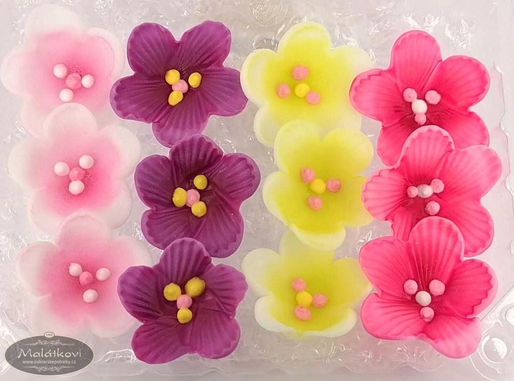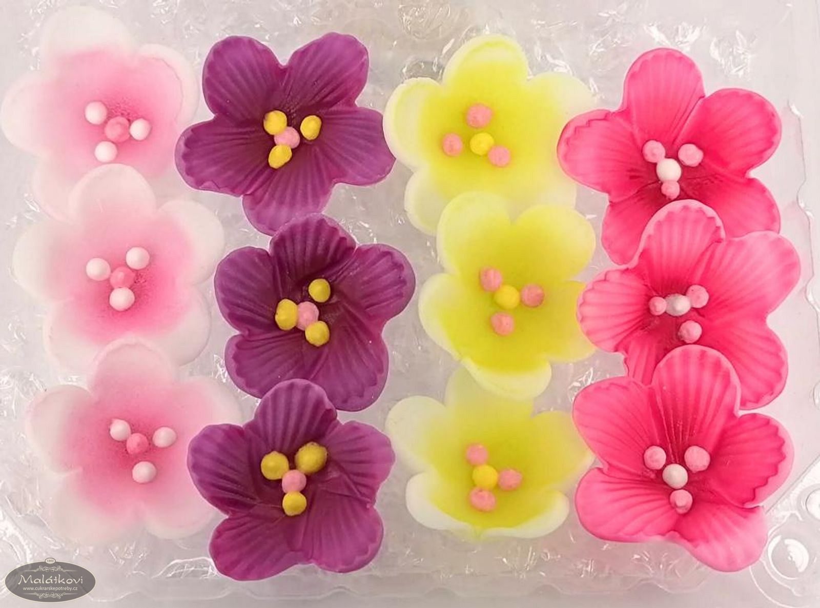 Ručně vyrobené květy z nové sněhově bílé na bázi cukru DecorHmoty. Použití na dorty, dětské dorty, zákusky atd. Šířka 3cm. Hmotnost: 3g/ks Cena za balení 12ks.