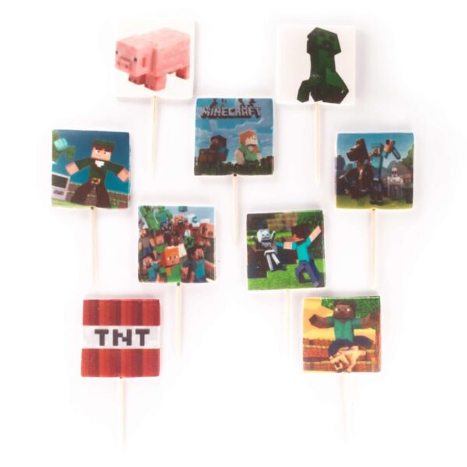 Tato cukrová dekorace na dort je sada zápichů v motivu Maincraft v 2D (plošném) provedení. Snadno se zapichuje do povrchu dortu a rychle dodá jednotný motiv bez složitého zdobení.