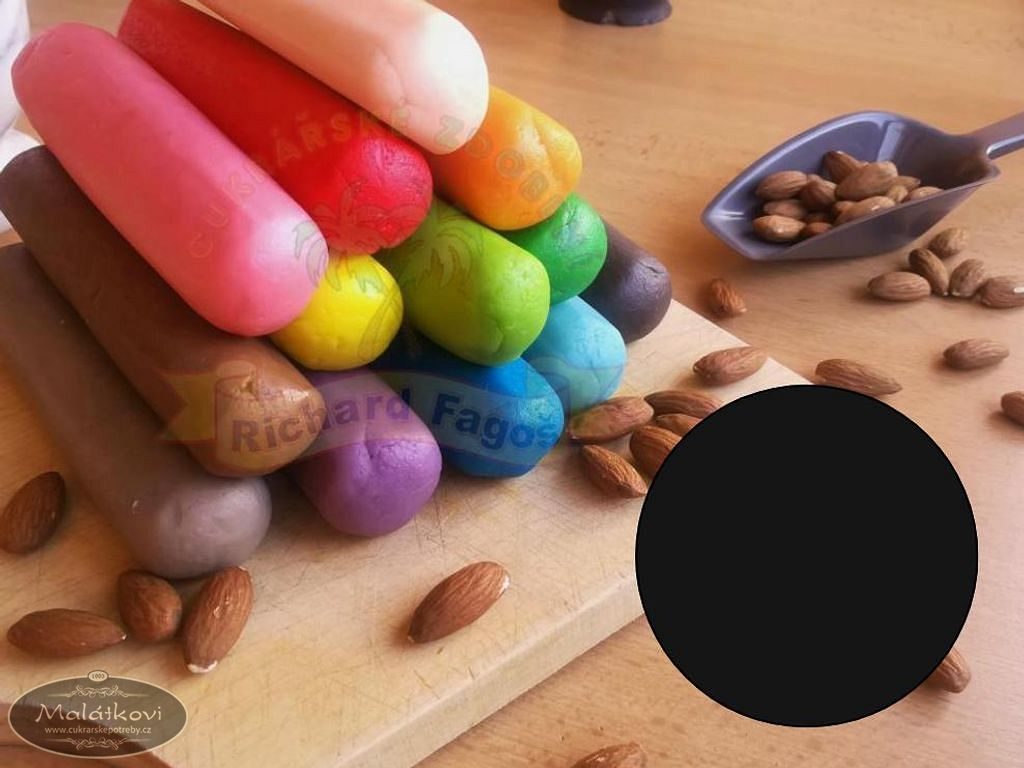 Marcipánová hmota určená k modelování postaviček nebo k dekoraci cukrářských ozdob. Obsahuje vysoký podíl mandlí a je dodávaný v poměru 1:3 (mandlová hmota – cukr). Marcipán je měkké a jemné konzistence. Pro práci s marcipánem doporučujeme pokojovou teplotu, tedy 21°C. Složení: Cukr, mandle 25%(alergen), stabilizátor E420, zahušťovadlo E466, kyselina E330, stabilizátor E1103, konzervant E202, kakao, barvivo E151,E102*,E110*,E122.*Tato barviva mohou nepříznivě ovlivňovat činnost a pozornost dětí. Výživové údaje (100g): Energetická hodnota 1725KJ/413kcal Tuky 10,6g z toho nas.mastné kys. 1,1g Vláknina 2,2g Sacharidy 77,2g z toho cukry 72,1g Bílkoviny 4g Sůl 0g