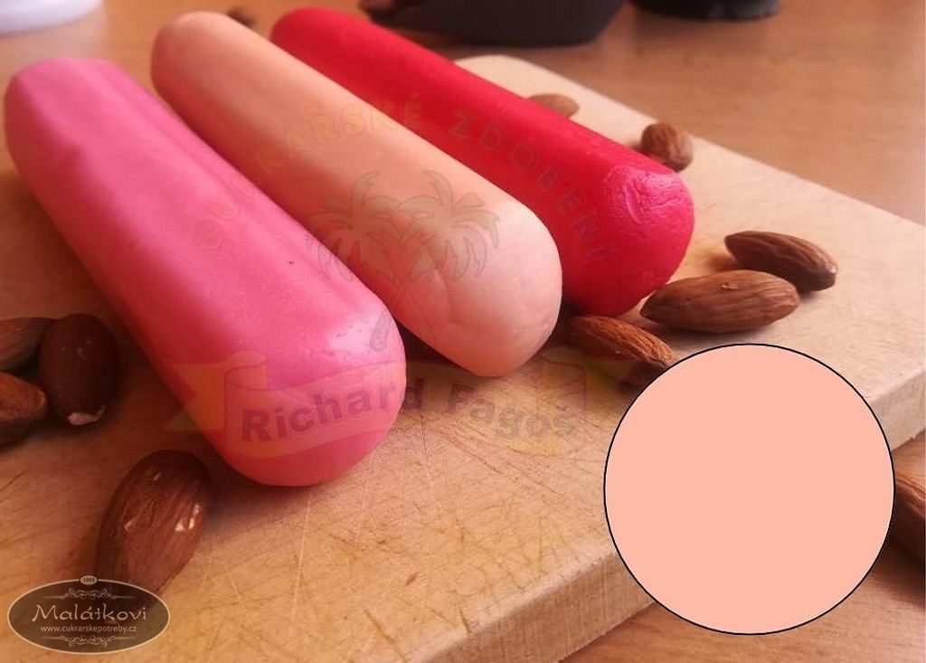 Pravý marcipán, který slouží k dekoraci cukrářských výrobků a taktéž k modelování jedlých postaviček. Pozitivní vlastností marcipánu je především jeho skvělá chuť a elasticita, což zajistí příjemnou manipulaci při modelování. Dalším aspektem je jeho hladká a jemná konzistence. Ideální teplotou pro práci s marcipánem je 21°C. Složení: Cukr, mandle 25%(alergen), stabilizátor E420, zahušťovadlo E466, kyselina E330, stabilizátor E1103, konzervant E202, barviva E102*,E110*,E122*,E124*. *Tato barviva mohou nepříznivě ovlivňovat činnost a pozornost dětí. Výživové údaje (100g): Energetická hodnota 1725KJ/413kcal Tuky 10,6g z toho nas.mastné kys. 1,1g Vláknina 2,2g Sacharidy 77,2g z toho cukry 72,1g Bílkoviny 4g Sůl 0g