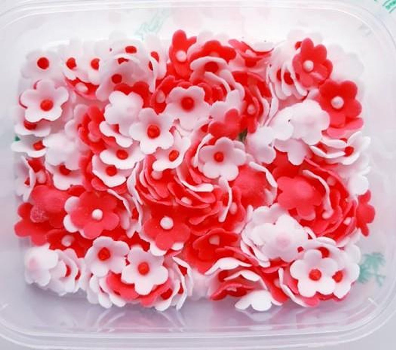 Ručně vyrobená kytička z nové DecorHmoty na bázi cukru. Použití na svatební dorty, dětské dorty, zákusky atd. Šířka 1cm. Cena za balení. V balení je cca 90 kusů.