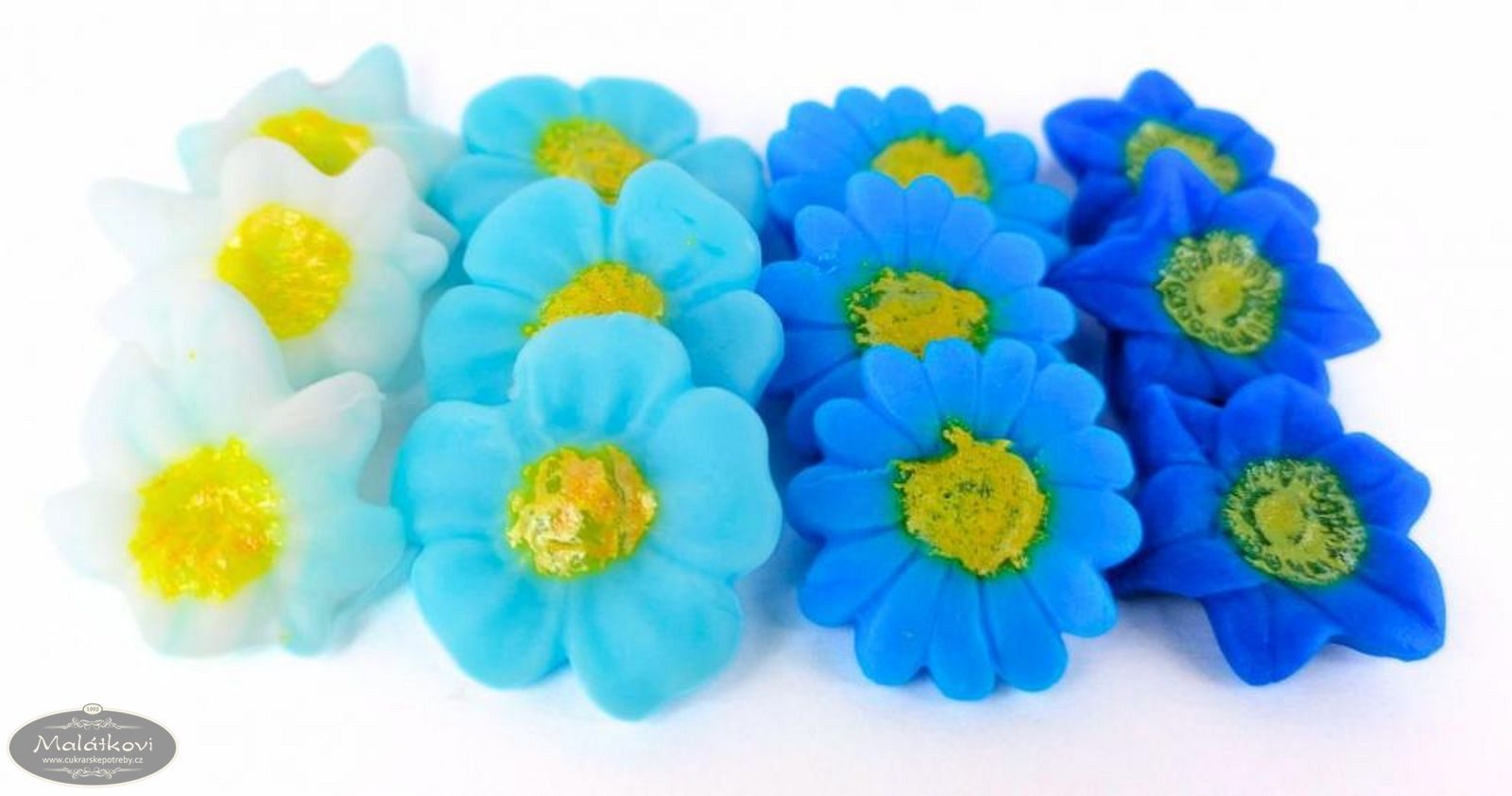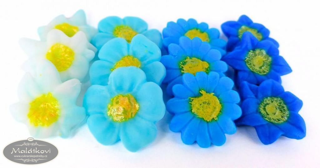 Směs vytlačovaných kytiček ve všech odstínech modré z DecorHmoty. Použití na svatební dorty, dětské dorty, zákusky, vánoční cukroví atd. Šířka 2cm. Cena za krabičku. V balení je 40 kusů.