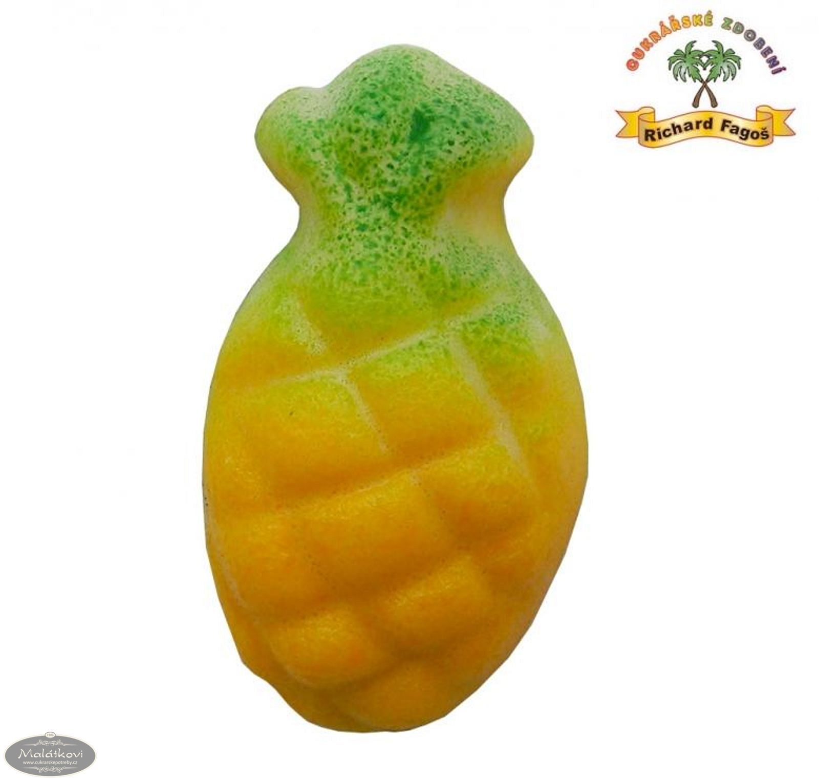 Jedlá ozdoba ve tvaru ananasu z modelovací hmoty. Výška cca 4 cm, šířka cca 2,5 cm. Složení: cukr, glukóz.sirup, suš.mléko(alergen), kokos, voda, mandlové aroma, konzer.E202, barviva E102*,E133. *může nepříznivě ovlivňovat činnost a pozornost dětí. Výživové údaje (100g): Energetická hodnota 1790KJ/424kcal Tuky 8,8g z toho nas.mastné kys. 8,3g Sacharidy 83,5g z toho cukry 77,5g Vláknina 2,2g Bílkoviny 1,6g Sůl 0,2g