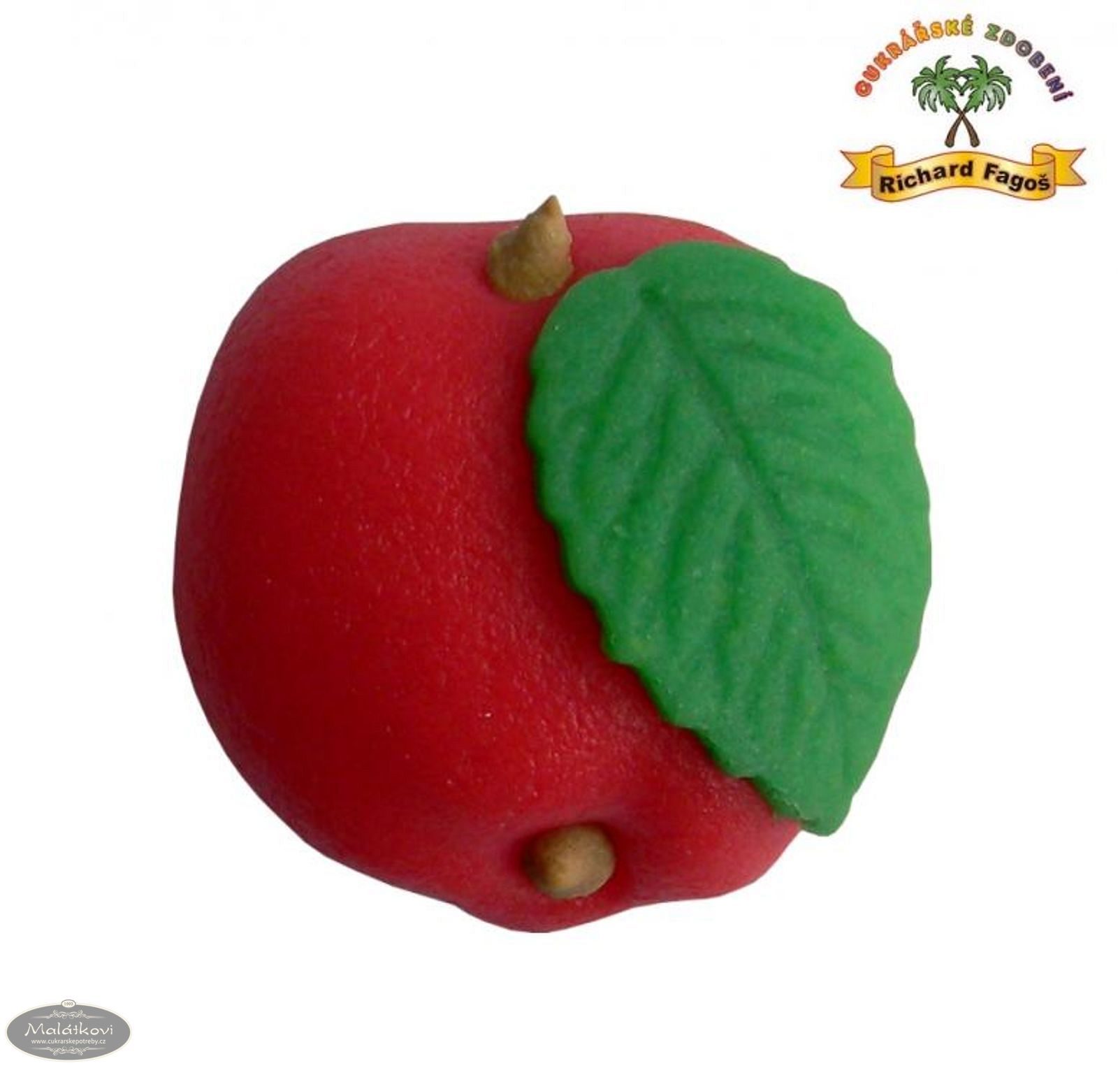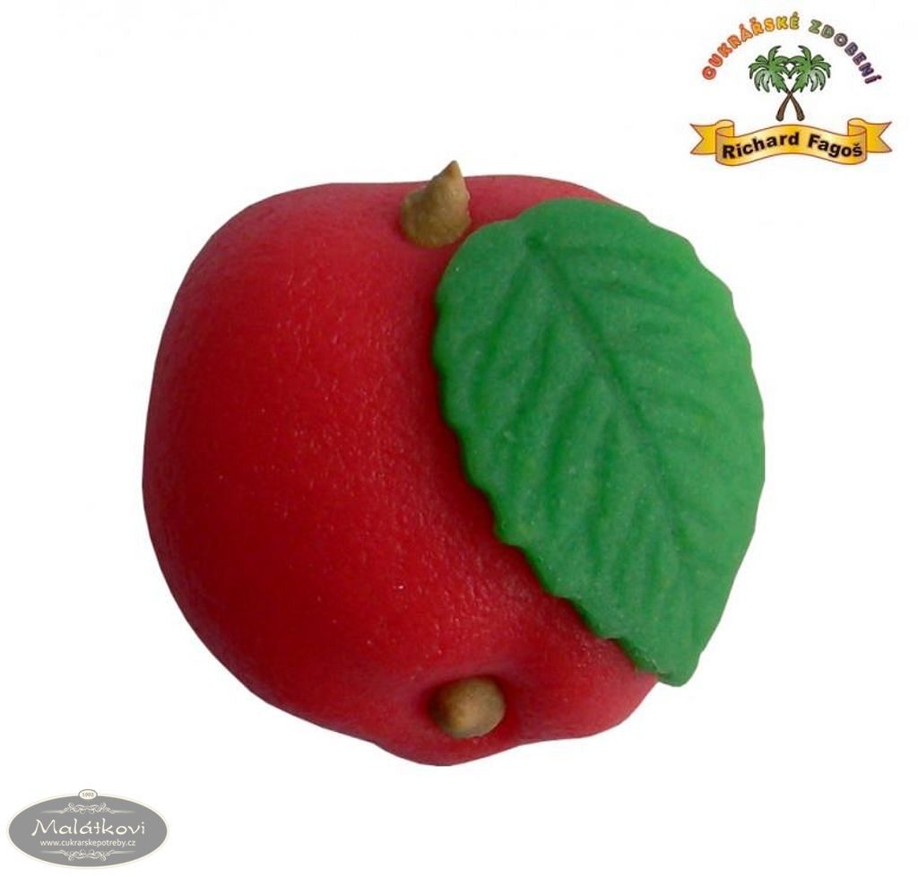 Jedlá ozdoba ve tvaru jablíčka z modelovací hmoty. Výška cca 2,8 cm, šířka cca 3 cm. Složení: cukr, glukóz.sirup, suš.mléko(alergen), kokos, voda, mandlové aroma,vaječný bílek(alergen), konzer.E202, barviva E151, E102*, E110*, E122*, E124*, E133. *Tato barviva mohou nepříznivě ovlivňovat činnost a pozornost dětí. Výživové údaje (100g): Energetická hodnota 1763KJ/417kcal Tuky 7,8g z toho nas.mastné kys. 7,3g Sacharidy 84,2g z toho cukry 78,8g Vláknina 2g Bílkoviny 1,6g Sůl 0,14g