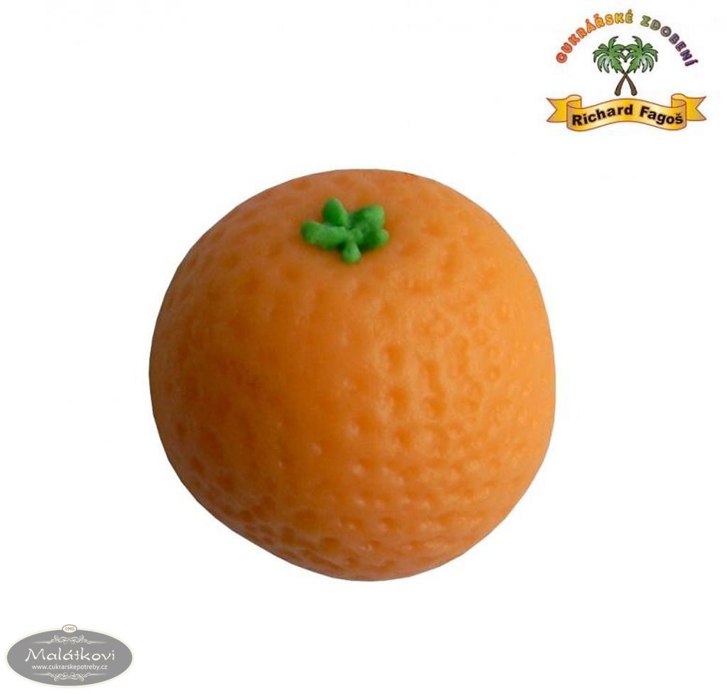 Jedlá ozdoba ve tvaru pomeranče z modelovací hmoty. Obvod cca 3 cm. Složení: cukr, glukóz.sirup, suš.mléko(alergen), kokos, voda, mandlové aroma, konzer.E202, barviva E102*,E133,E110*. *Tato barviva mohou nepříznivě ovlivňovat činnost a pozornost dětí. Výživové údaje (100g): Energetická hodnota 1763KJ/417kcal Tuky 7,8g z toho nas.mastné kys. 7,3g Sacharidy 84,2g z toho cukry 78,8g Vláknina 2g Bílkoviny 1,6g Sůl 0,14g