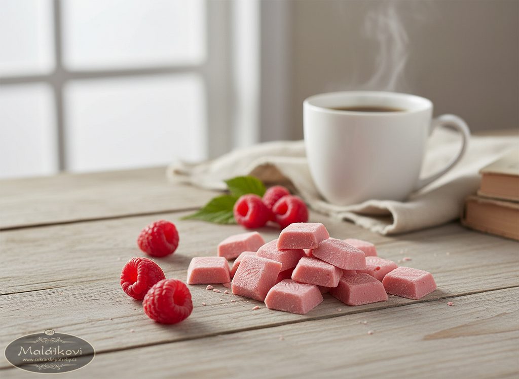 Složení výrobku:cukr, sušené mléko, kakaové máslo, sušené maliny ( 3% koncentrované malinové pyré, maltodextrin), sušené mléko odstředěné, emulgátor: sojový lecitin E322, přírodní aromata