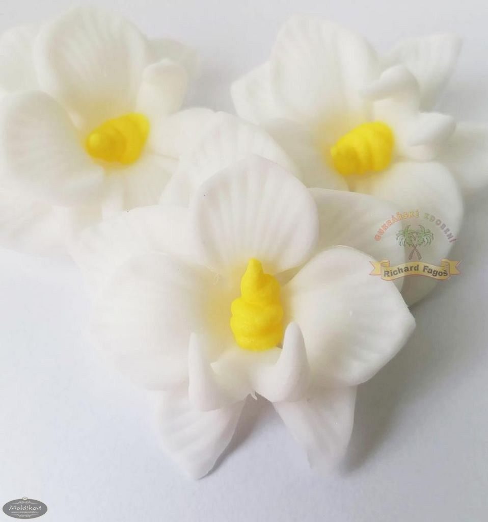 Ručně vyrobená orchidej z nové sněhově bílé na bázi cukru DecorHmoty. Použití na dorty, dětské dorty, zákusky atd. Šířka 5cm. Hmotnost: 10g Cena za 1 kus.