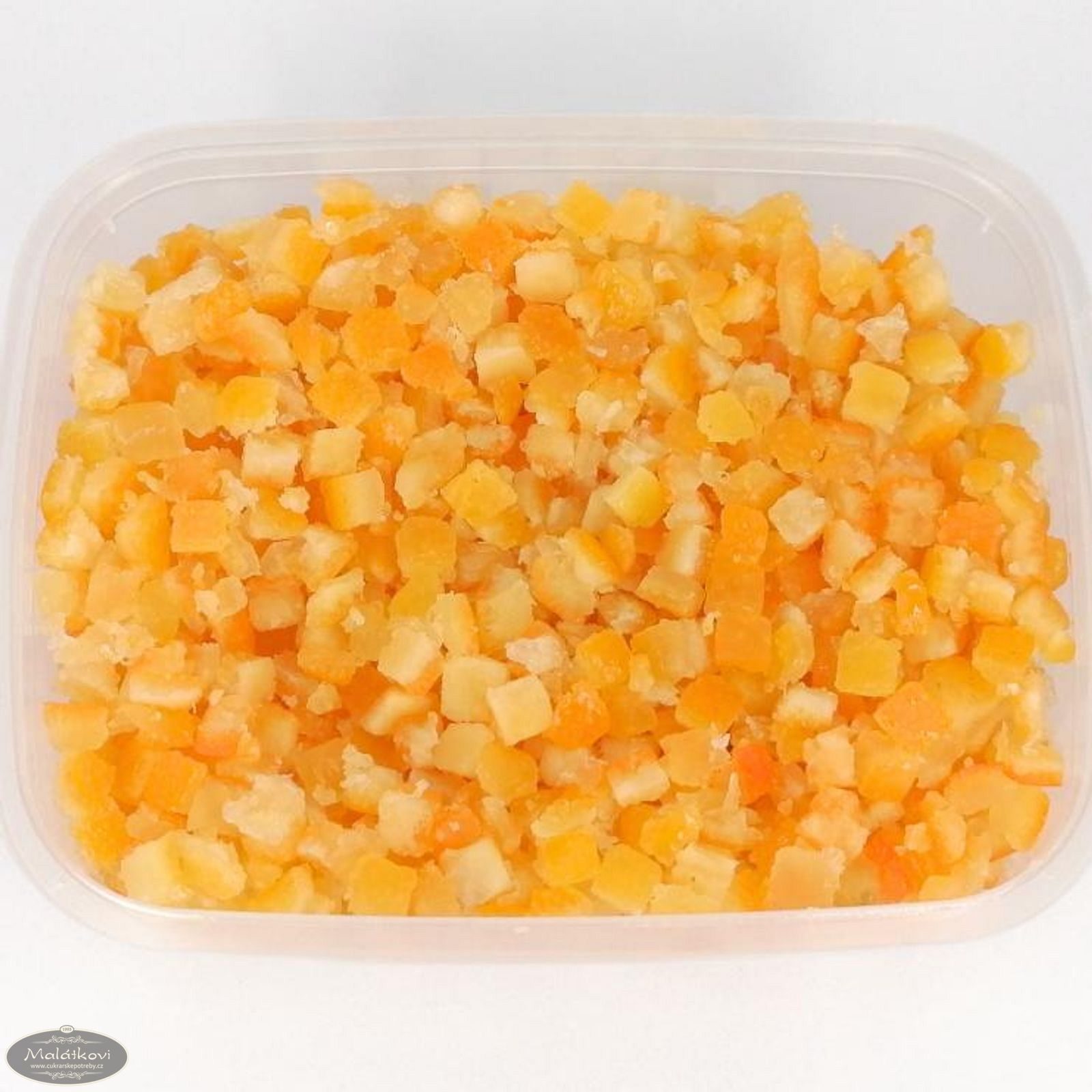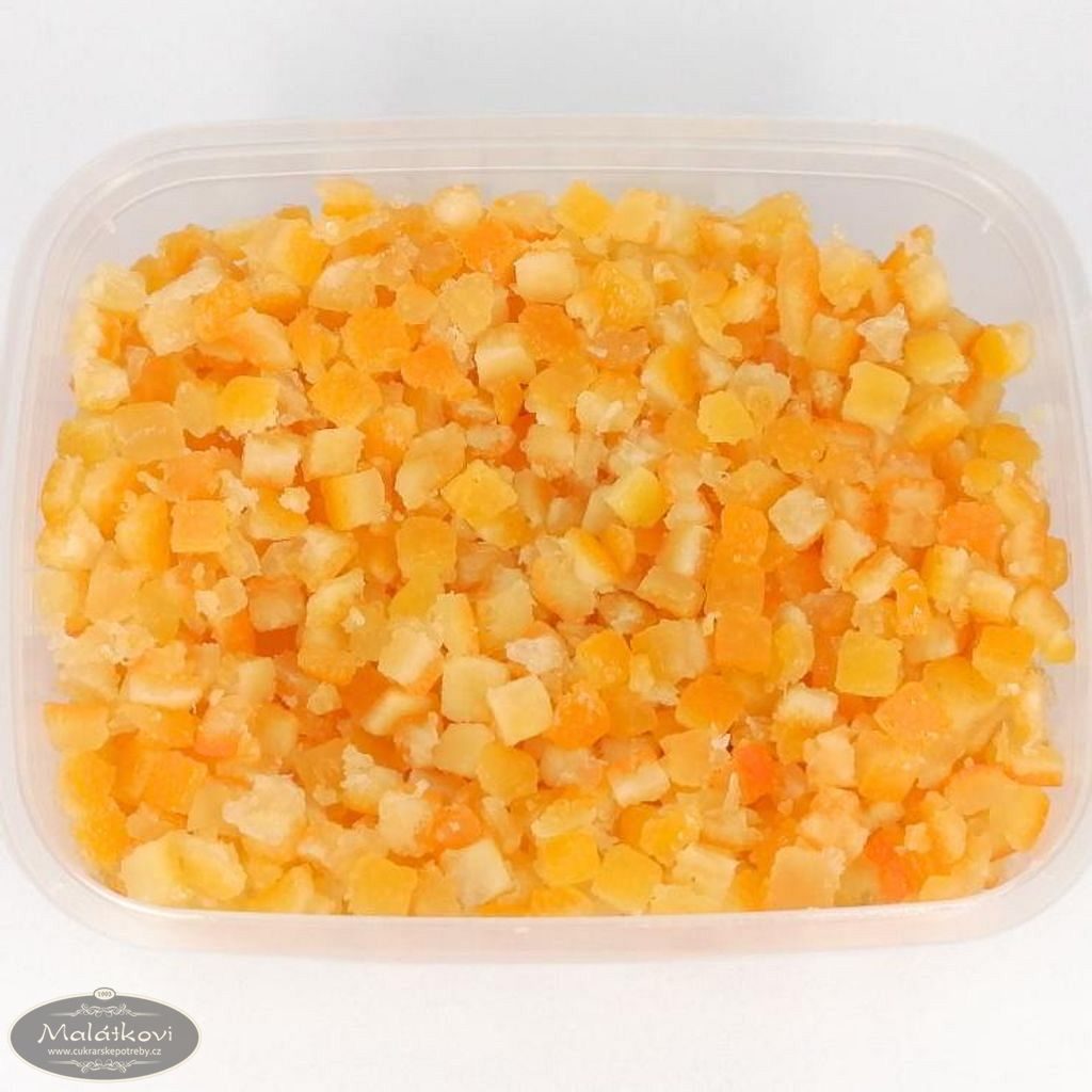 Kandovaná pomerančová kůra. Baleno po 100 gramech. Používá se především na pečení i na dekoraci dortů a zákusků, o Vánocích do různých druhů těst. Složení: pomeranč. kůra 61,25%, cukr 34,0, sirup glukóza-fruktóza 3,85, reg. kys.: kys.citr. E330, konzer. E202, E223, aroma.Může obsahovat siřičitany.