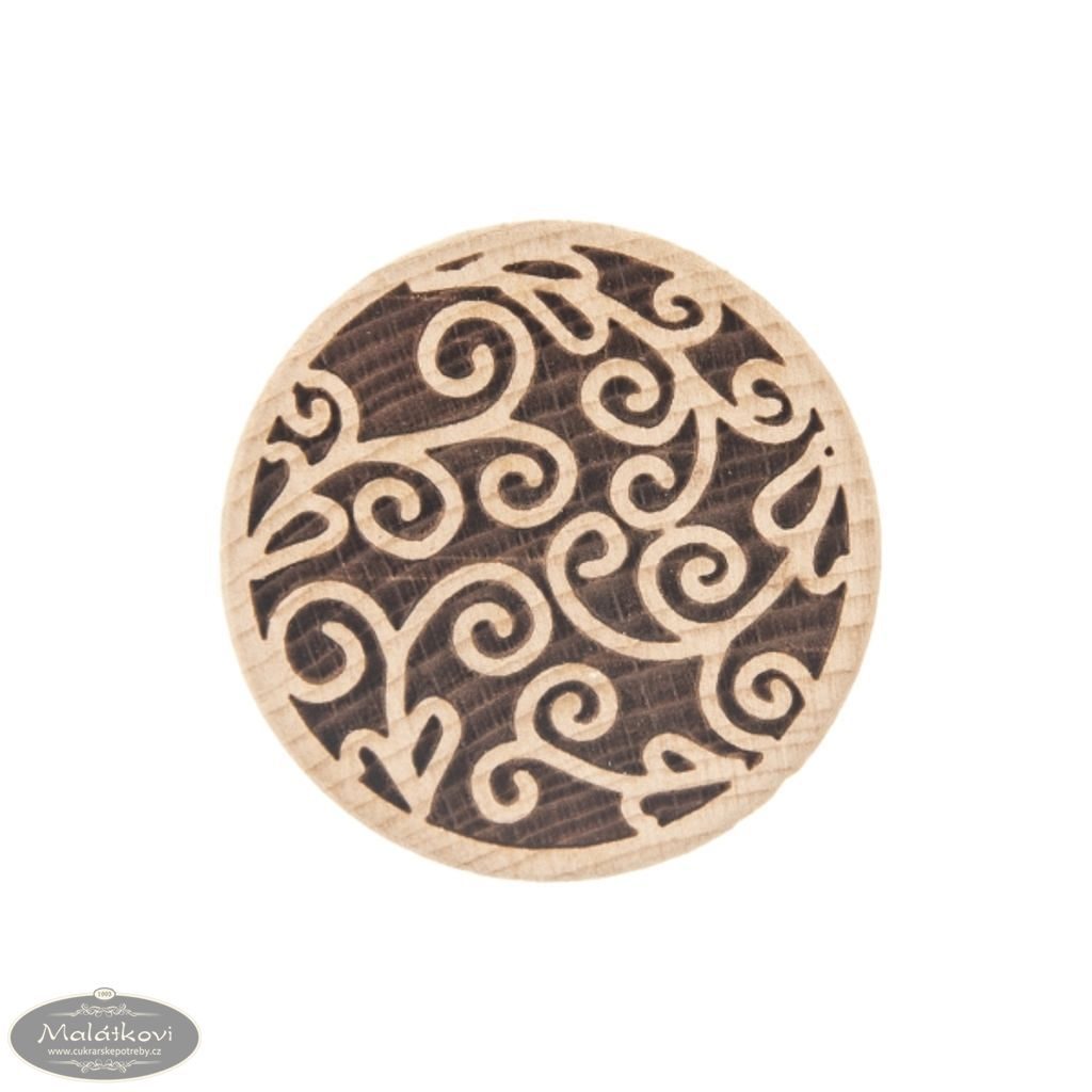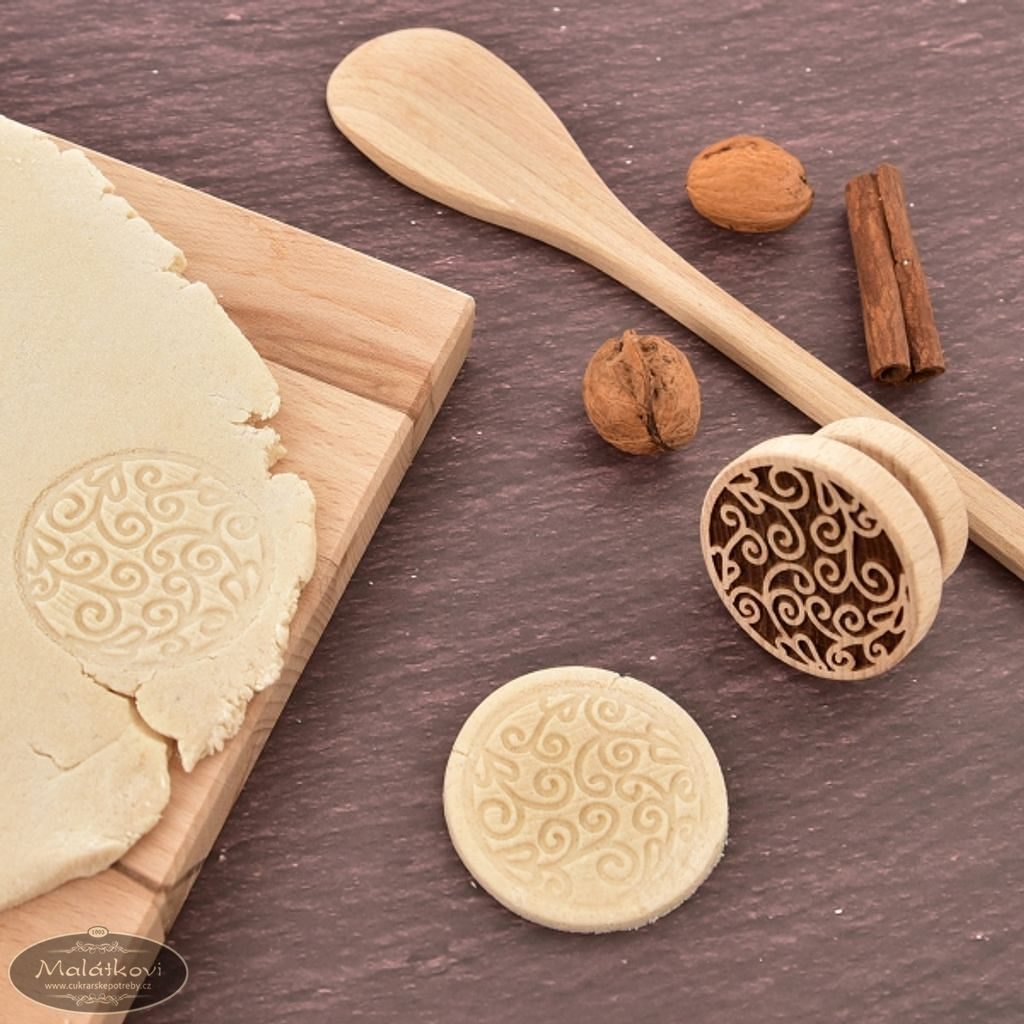 Zábava pro velké i malé pekaře s originálním razítkem z bukového dřeva. Do vyváleného těsta, ideálně takového, které neobsahuje kypřící přísady nebo sodu, stačí otisknout razítko a běžnou kulatou vykrajovačkou průměru 5,5-6 cm vykrojit sušenku. Bude mít krásný plastický reliéf zobrazující rostlinné úponky, který potěší vaše milované nejen při narozeninách a na návštěvě, ale třeba jen tak, u odpolední kávy nebo dobrého čaje.