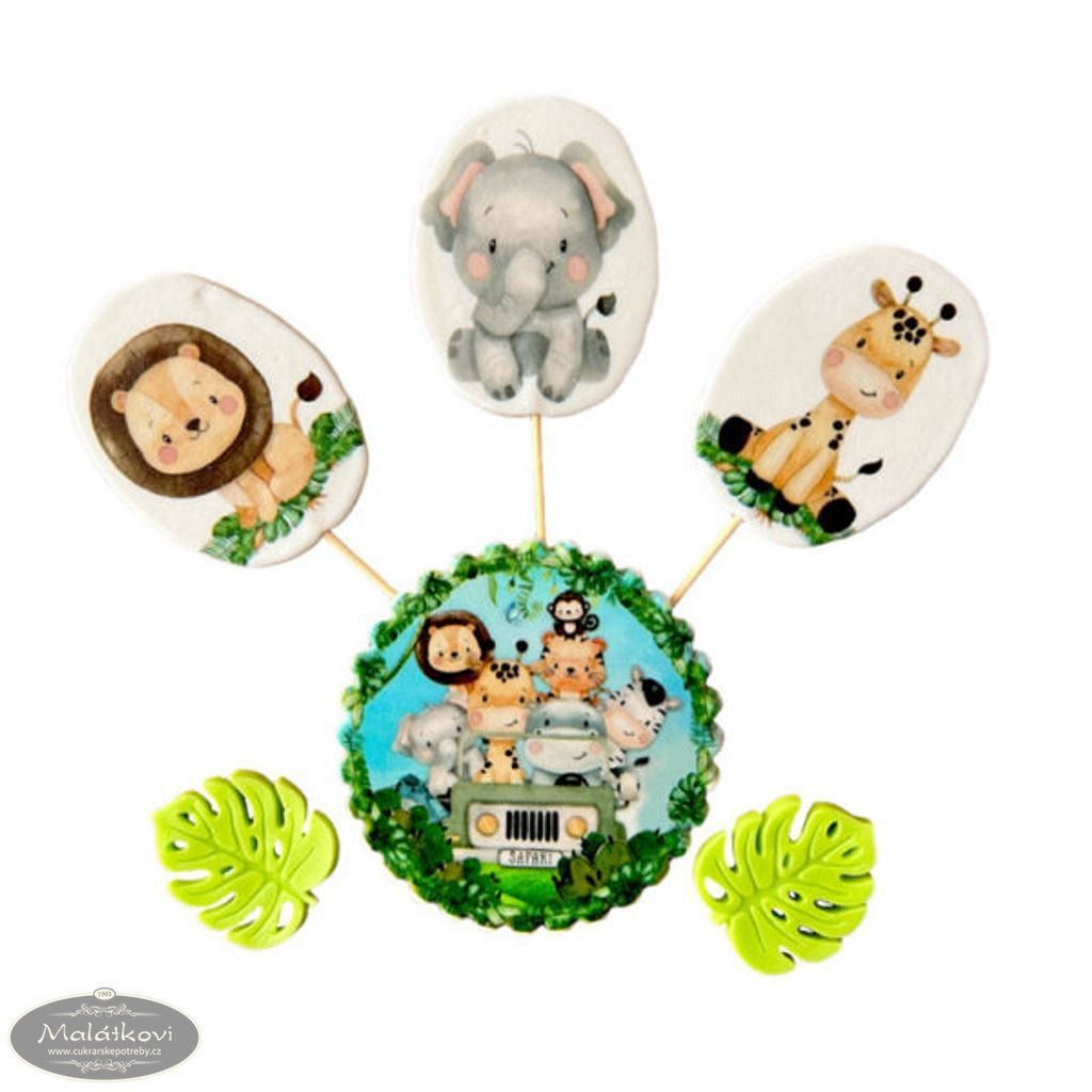 Cukrová dekorace na dort v podobě sady zvířátek ze safari. Vhodná pro všechny typy dortů – jednoduché ozdobení bez složitého modelování.