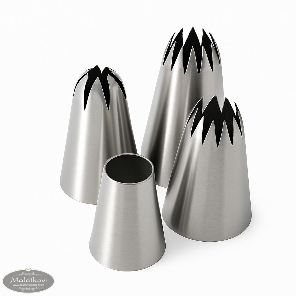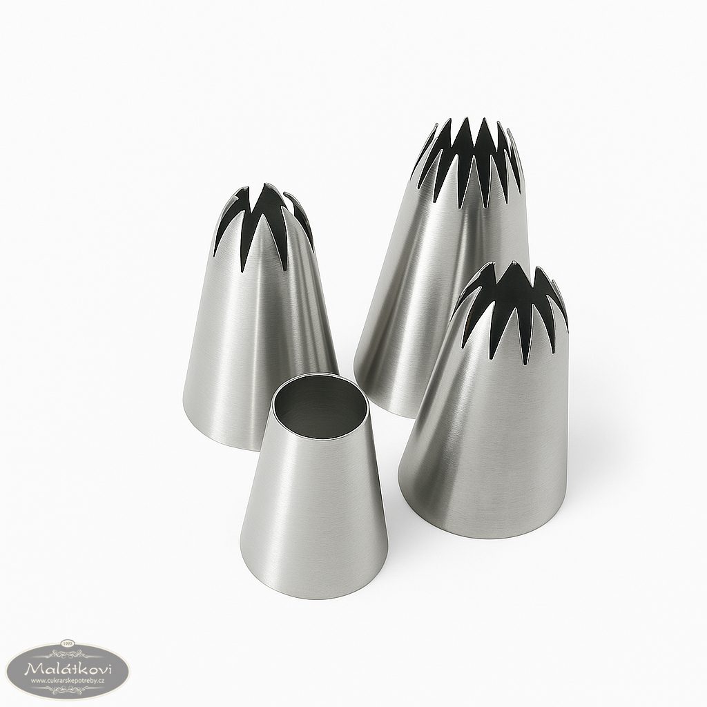 Profesionální sada čtyř nerezových cukrářských špiček, vhodná pro zdobení dortů, cupcaků, dezertů i slaných specialit. Tři špičky mají hvězdicový tvar s různě širokými zuby pro originální efekty, jedna je klasická hladká pro univerzální použití.