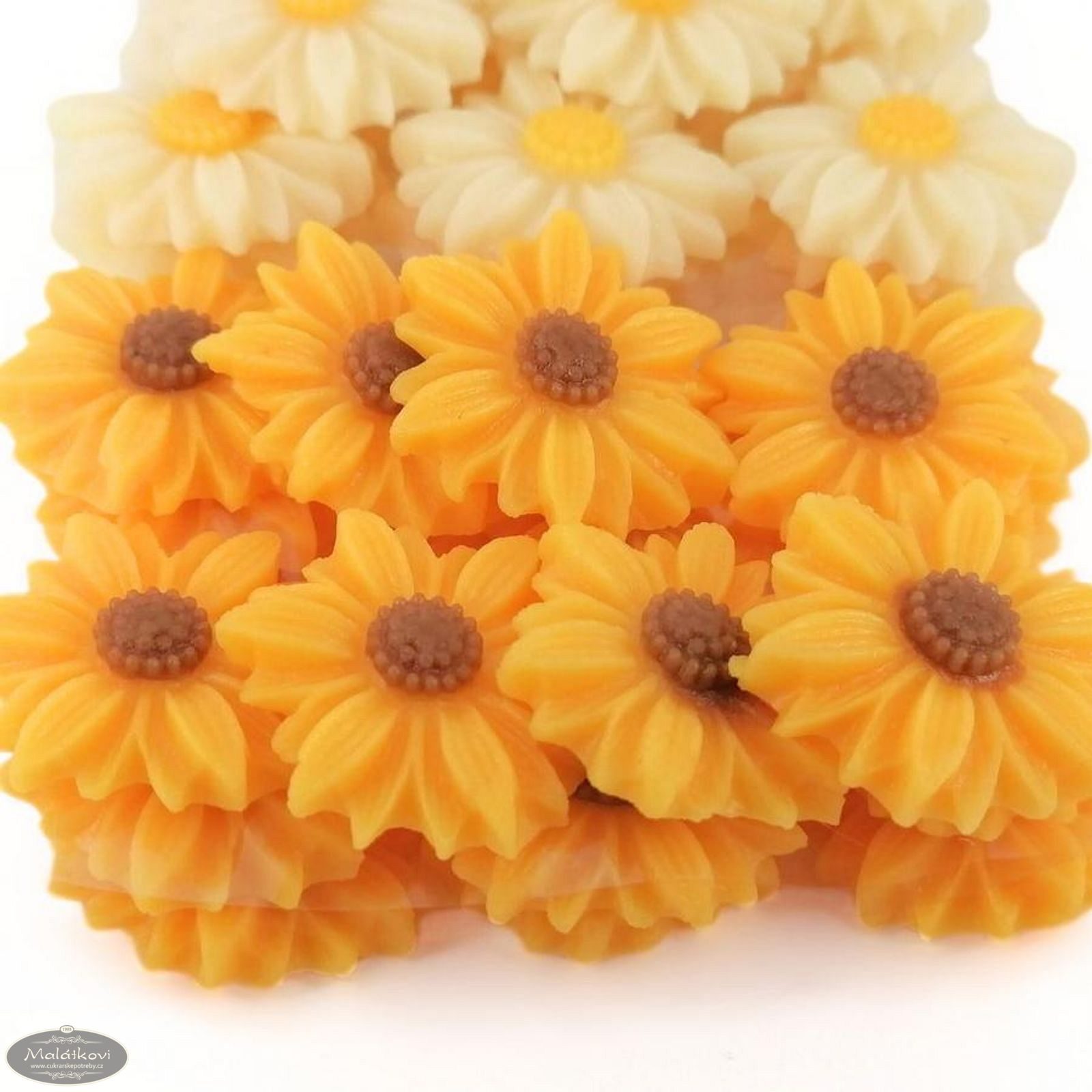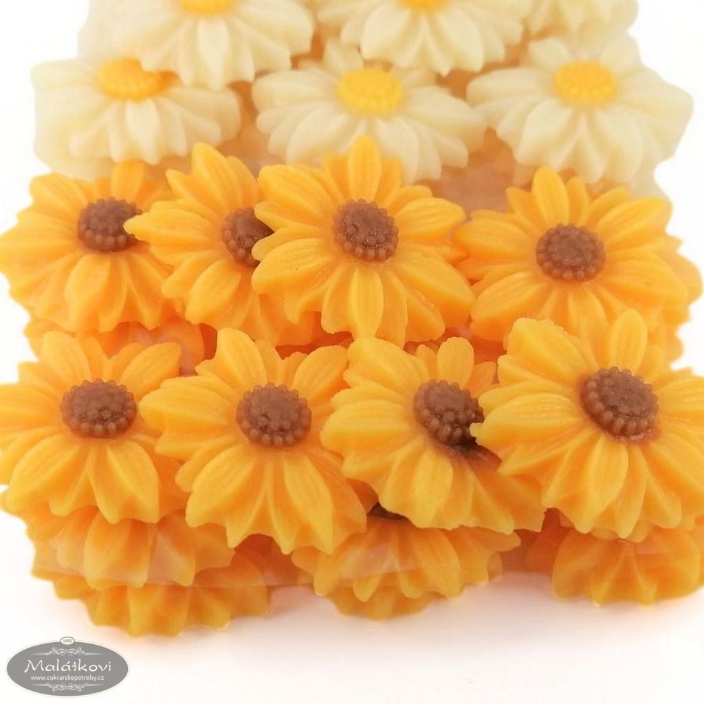 Ručně vyrobených 20 kusů slunečnic z kokosové modelovací hmoty s příchutí aroma sladkých mandlí. Použití na dorty, zákusky atd. Velikost kytičky 2 cm.