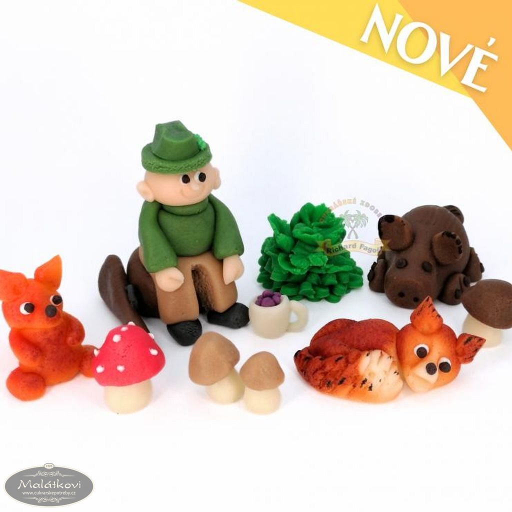 Set myslivec na dort obsahuje: myslivec na pařezu, puška, keř, veverka, liška, divočák, hříbky - houby, borůvky. Jedlé ozdoby na dort jsou z kokosové modelovací hmoty s příchutí aroma sladkých mandlí podobné marcipánu. Použití na dorty, zákusky atd. Cena za balení celý set. Hmotnost 160g.