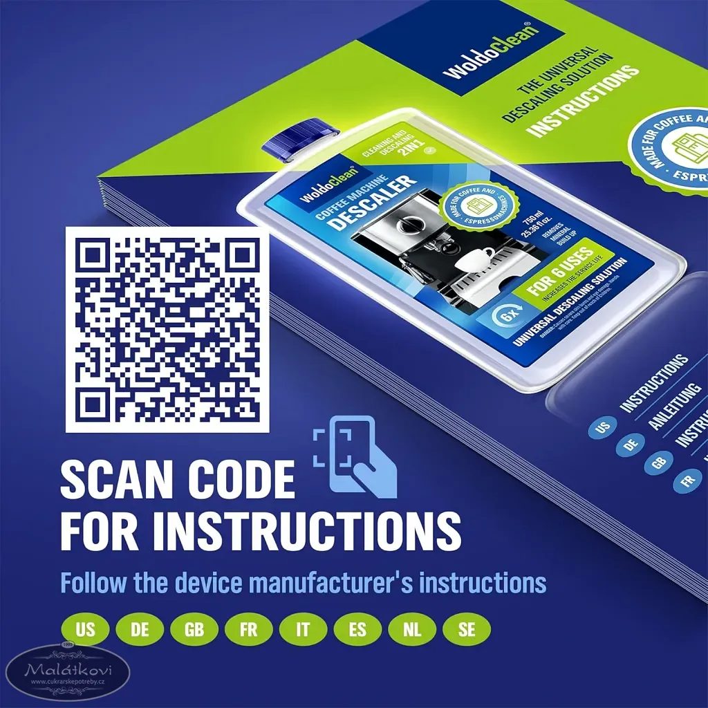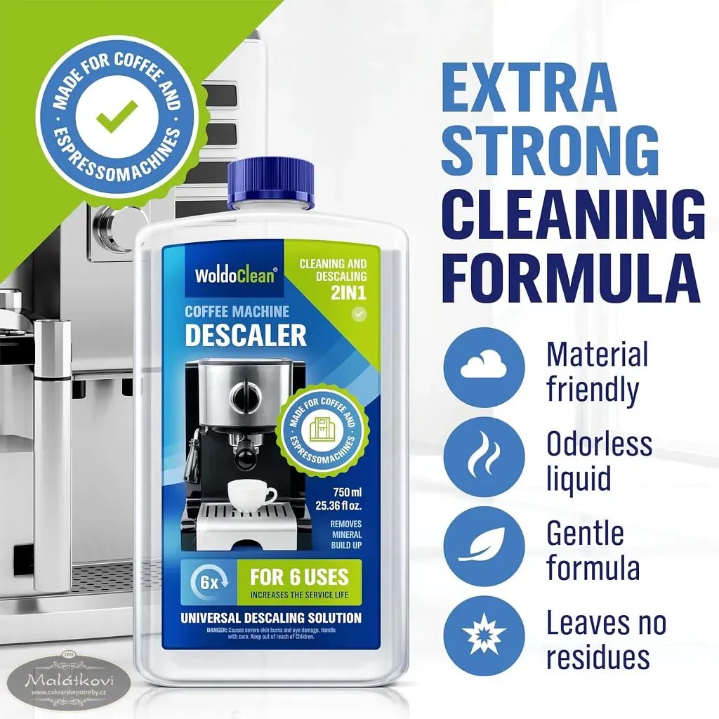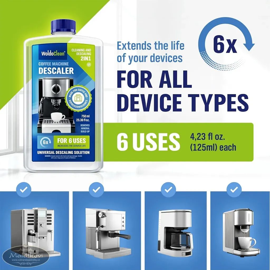 Tekutý odvápňovač odstraní vápenaté usazeniny uvolňuje a odstraňuje vodní kámen v kávovarech, varných konvicích, parních troubách, myčce, pračce, parních čističkách, zařízení produkujicí horkou páru, parních generátorech atd.
