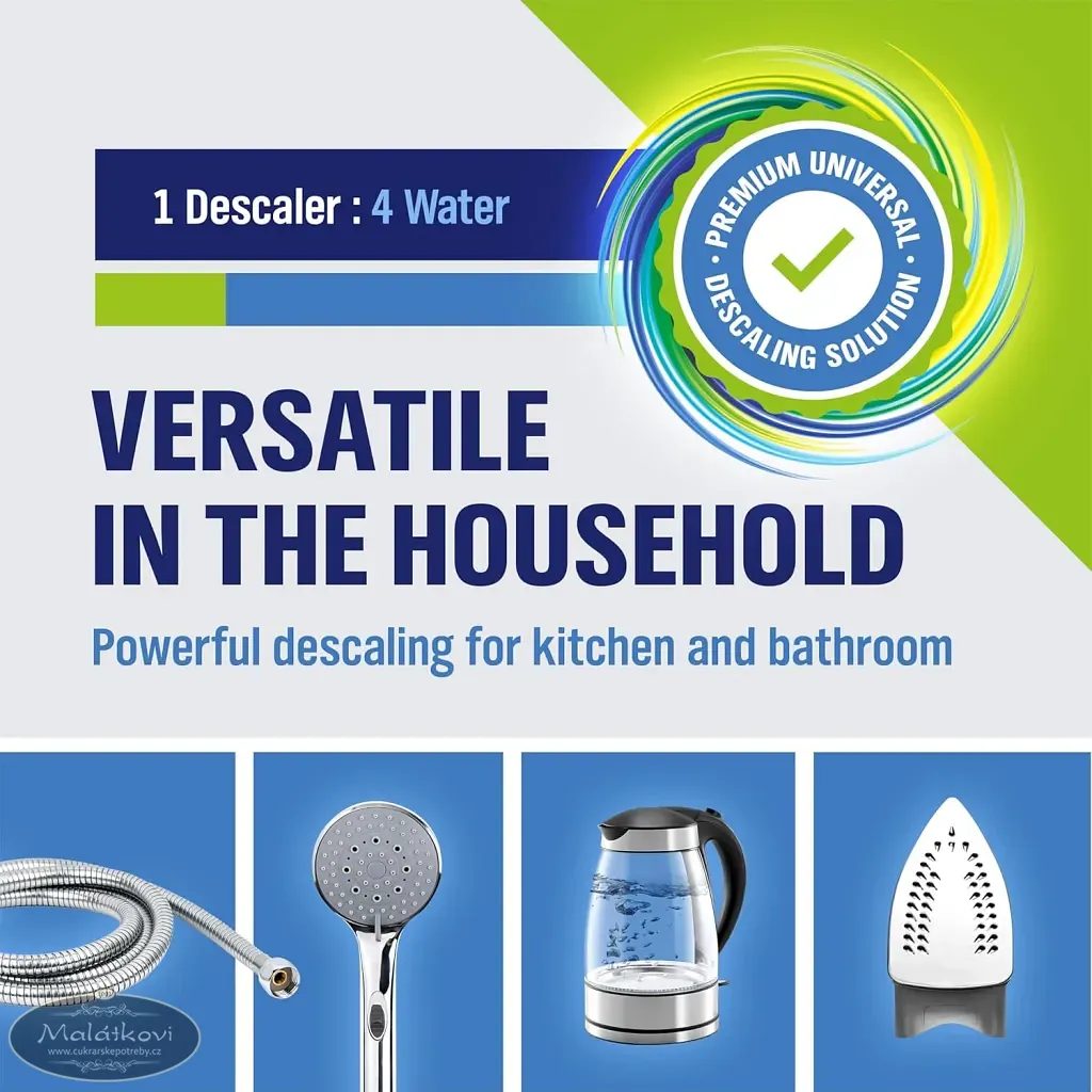 Perfektní odvápnění a jeho využití v domácnosti a průmyslu - tento silný koncentrát je vhodný jako čistič do koupelen a sanitu.Odstraňuje uhličitan vápenatý při prvním použití, lze použít rovněž na armatury, sprchové hlavice, vodní filtry a ponorné ohřívače vody