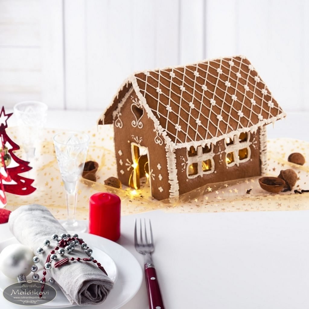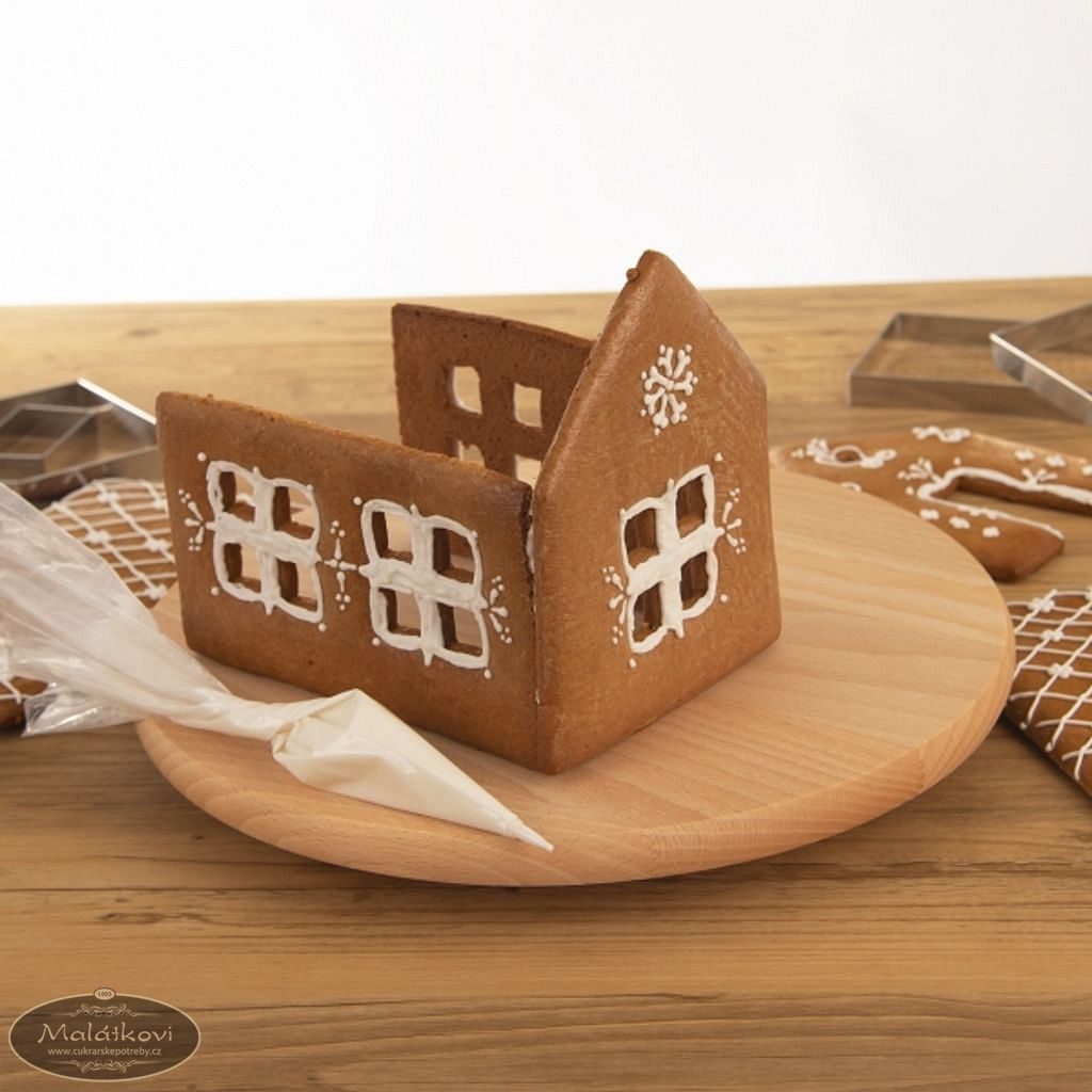Z vyváleného perníkového těsta tak podle návodu snadno vykrojíte boky, čela chaloupky i střechu, drobné vykrajovačky pomohou vytvořit okna a dveře. Po upečení stačí jednotlivé díly spojit bílkovou polevou a nazdobit podle vlastní fantazie. Vytvoříte tak chaloupku vysokou cca 15 cm (v závislosti na složení a síle vyváleného těsta), d. cca 16 cm, š. cca 11 cm.